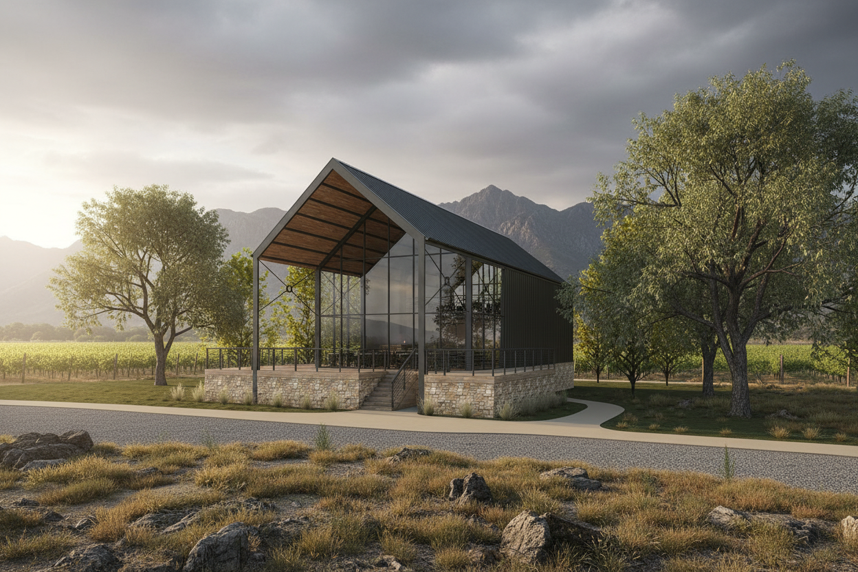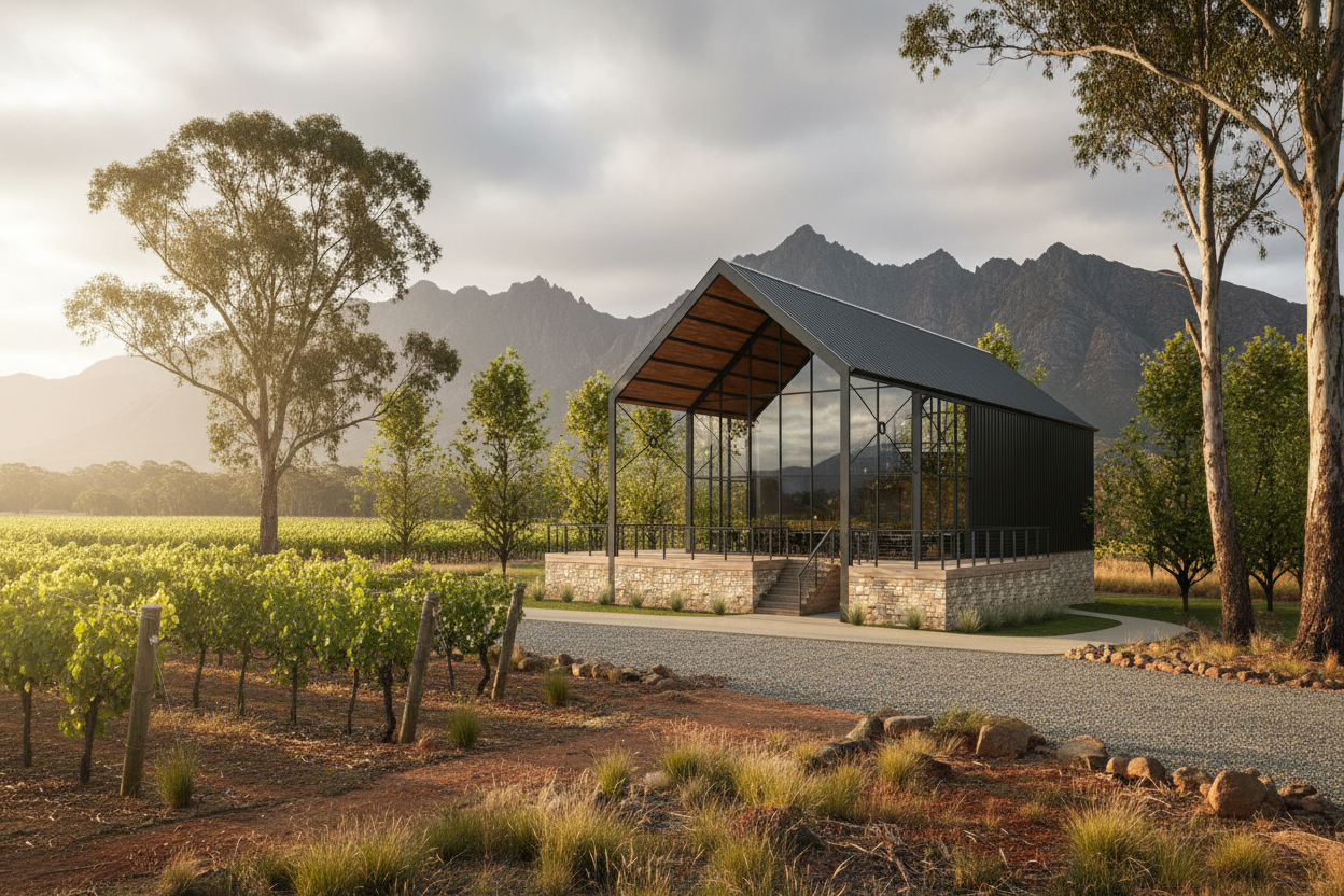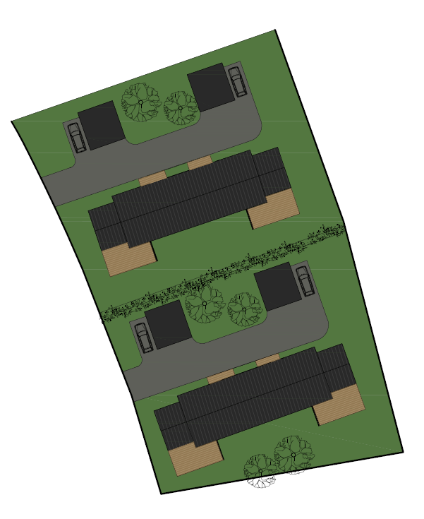 beautiful residential landscape design featuring modern black rooftops and soft brown wooden decks lush green lawns with vibrant green trees enhance the scenery the smooth gray pathways lead to sleek black garages create a peaceful sunny atmosphere with soft natural lighting to highlight the harmonious balance of architecture and nature