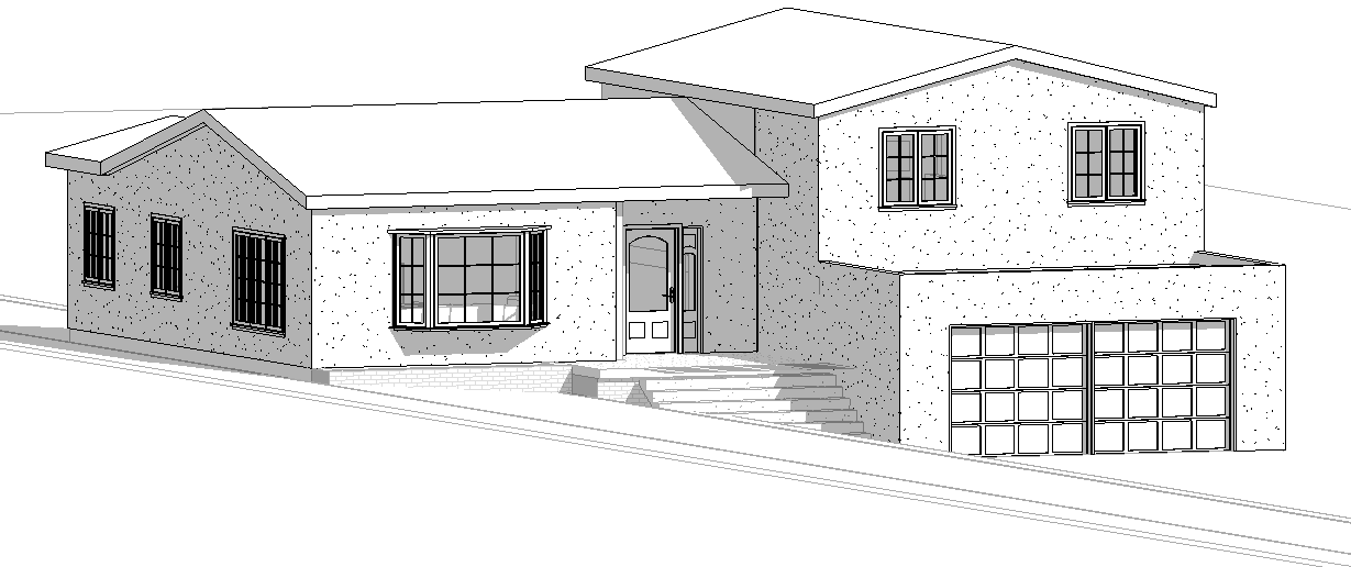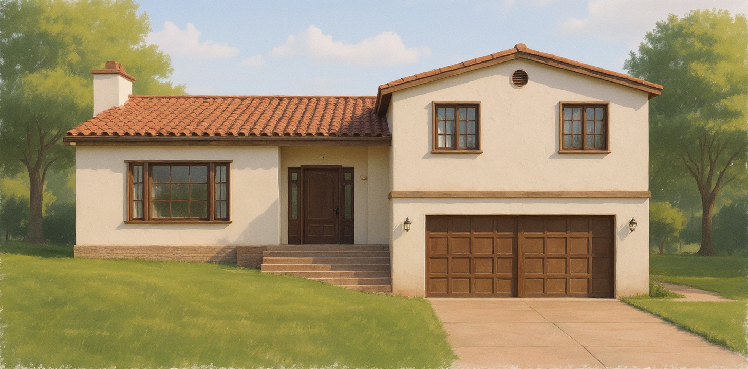 spanish revival house brown door white stucco walls red clay tile roof change environment to be more desert like add more landscaping to environment change rendering to water color sketch