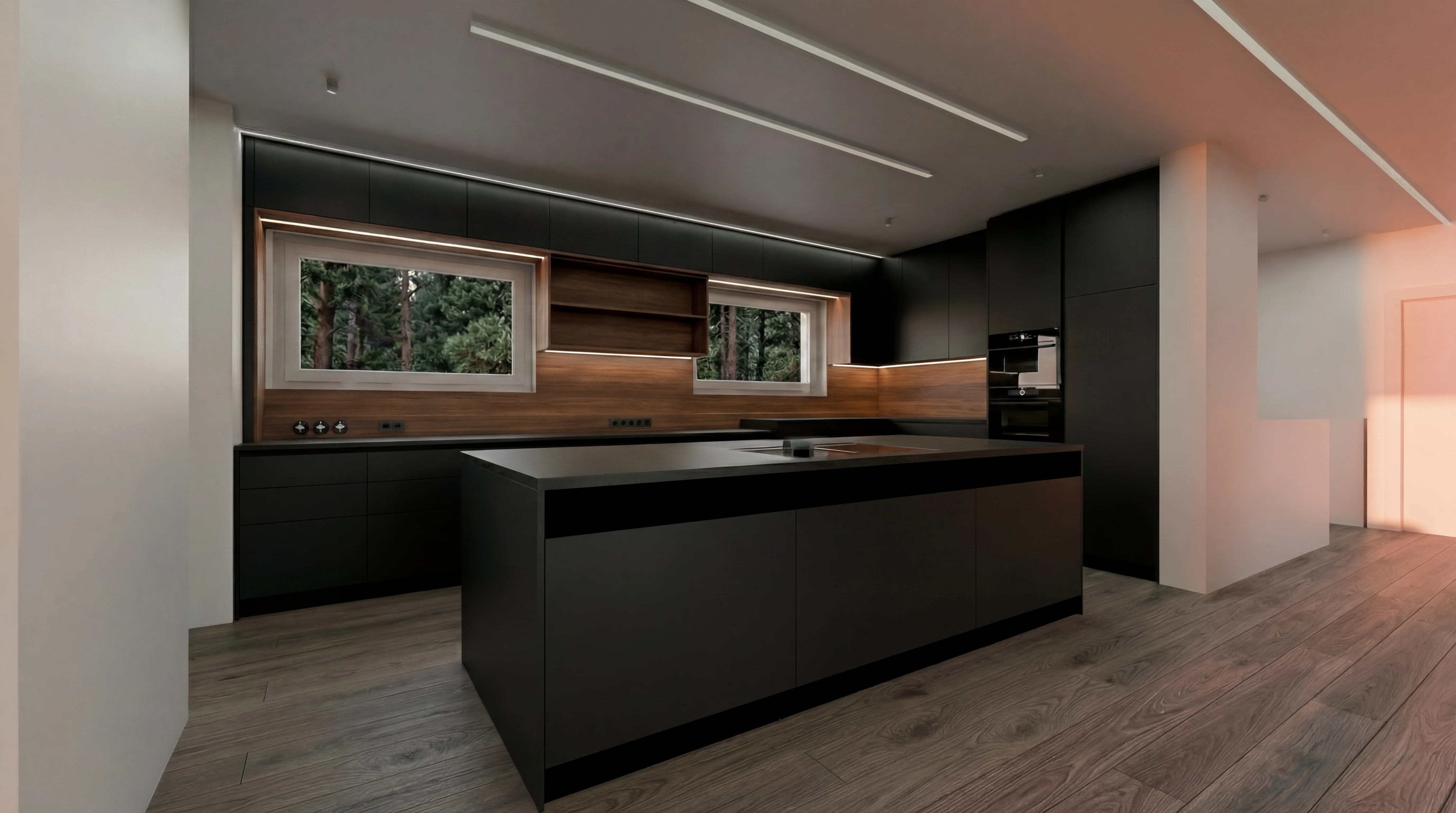 high end walk in closet luxury dressing room smoked glass wardrobes with black metal frames warm smoked oak wooden floor exposed concrete ceiling with refined texturenatural daylight coming through windows soft diffused daylight bright but soft lighting realistic interior photography style balanced exposure no harsh shadowselegant minimalistic design warm and neutral tones premium materials subtle reflections in glass clean and calm atmosphererealistic materials natural imperfections soft shadows no flat lighting no overexposed highlightsdaylight interior bright natural light soft daylight illumination no artificial warm lighting dominancesoft sunlight entering space gentle highlights architectural photography lighting