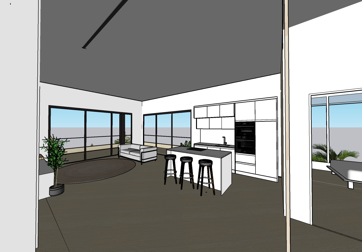 exterior shot modern open plan kitchen and living room with large doors with ocean views use warm beige walls and a travertine gloss tile floor the ceiling is a white with recessed lighting include a glossy white kitchen island with sleek black stools and stainless steel appliances the sofa is light gray with plush cushions the rug is jute complementing the greenery of vibrant indoor plants the atmosphere is cozy and inviting with natural sunlight streaming through the windows casting soft shadows