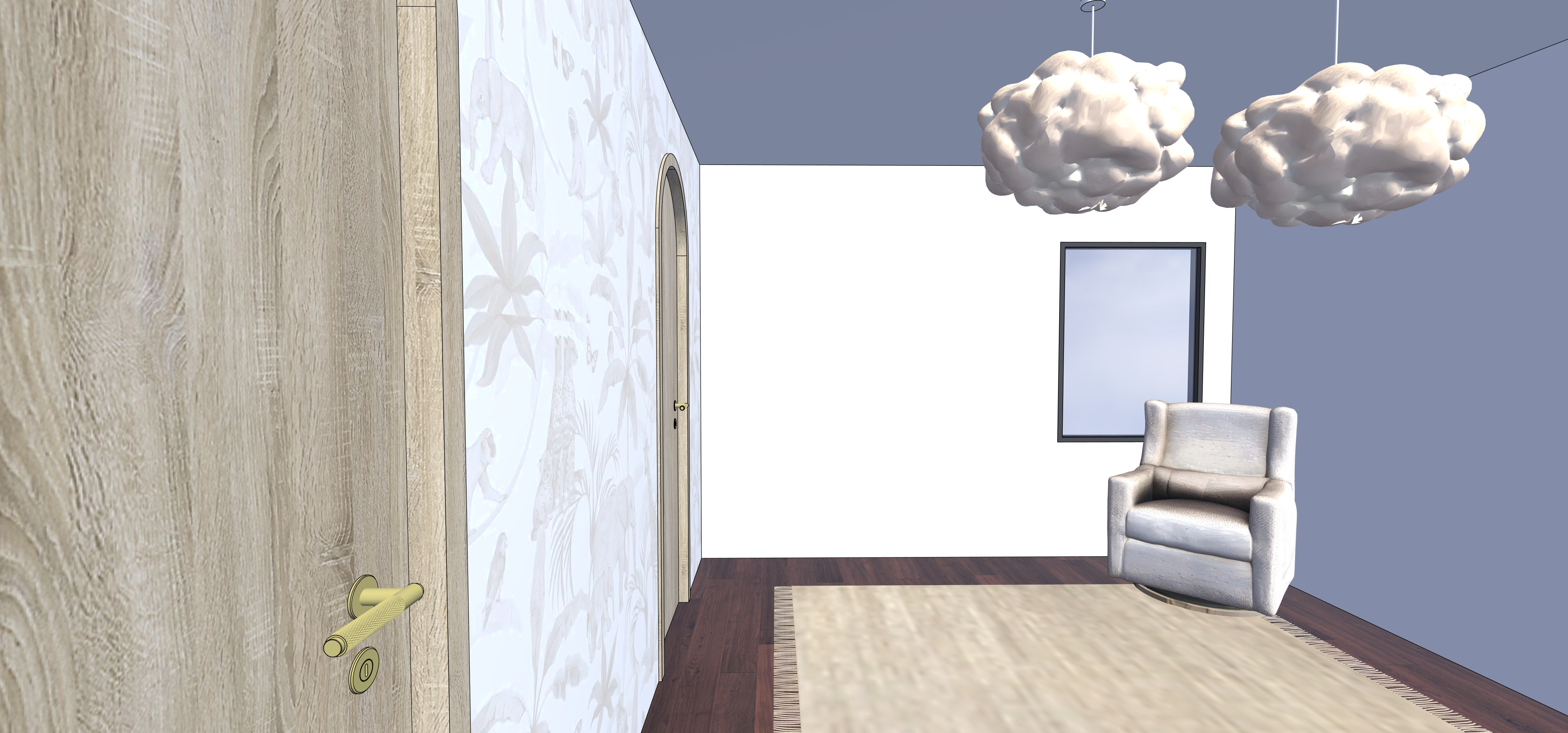 real interior architectural photography conversion print to render accuracy with dslr realism keep original architecture layout volumes materials cabinetry furniture placement and camera framing exactly as the reference image scene elements light wood door with brass handle in the foreground illustrated wallpaper with animals arched doorway with wood trim dark wood flooring light rug with fringes fabric armchair in the background two decorative cloud pendant lamps framed artwork on the wall lighting late afternoon sunlight entering from the window warm natural sunlight low sun angle balanced exposure realistic shadow direction material realism natural wood grain textile fibers visible subtle wallpaper texture realistic floor reflections natural imperfections camera full frame dslr simulation 50mm lens corrected verticals realistic depth of field final image must look like a real photograph not a render and not an ai stylized image avoid cgi render illustration 3d look stylization artistic lighting fake materials oversharpening oversaturation distorted perspective