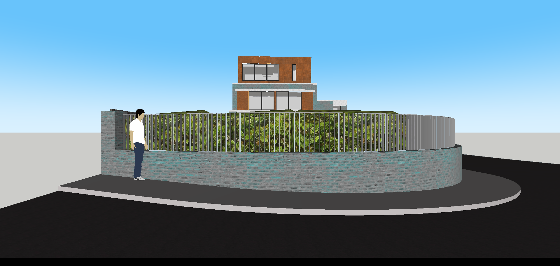 make this look like a sketch very subtle light grey brick wall with railing on top sketch in colour colour add addtional brick piers