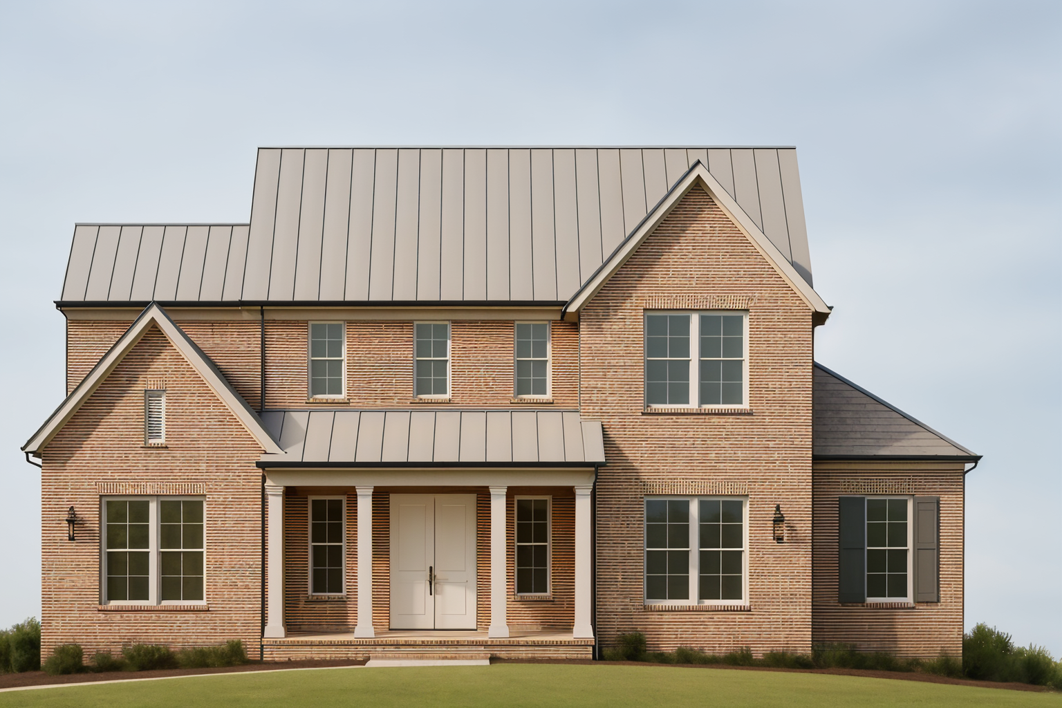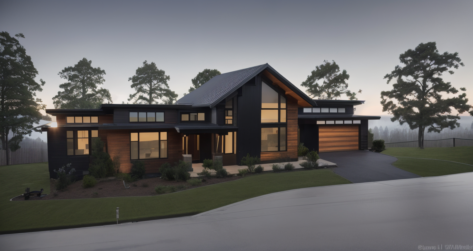 render elevation with a craftsman style architecture with light earth tone cultured stone dark bronze color horizontal siding with a weatherwood color roof and front grass yard and tree line behind
