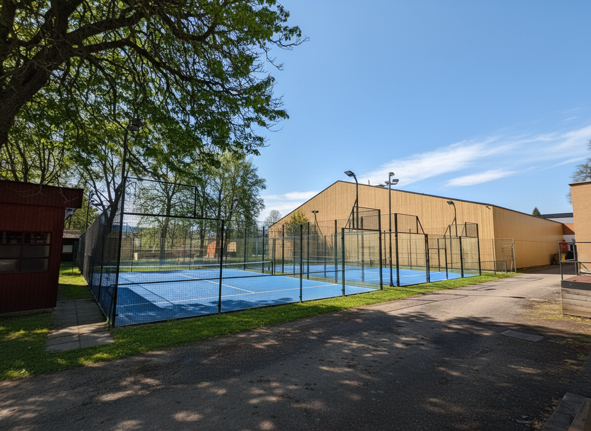 add realism to this image and as for materials in the facade the concrete surface is all the same white solid color not rough its matte and in front of the windows dark color grey close to black metallic frame holding a thin metal grating grill panel and soft oxidized metallic texture in the entrance door and the give a view in a warm sunset about 19 00 blue hour serene atmosphere not many clouds more warm