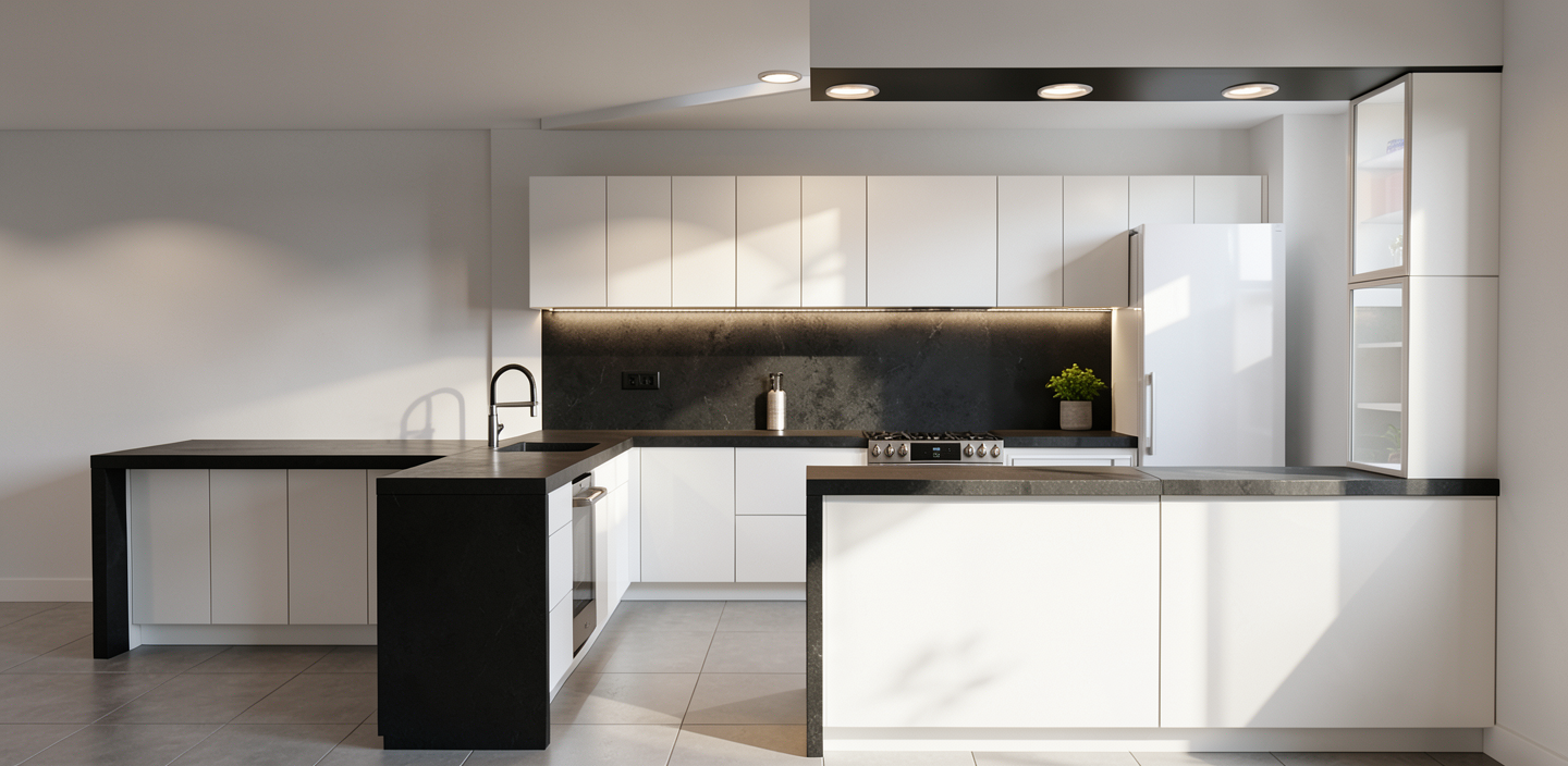 ultra realistic architectural visualization of a modern barndominium style home on a sloped hillside surrounded by a dense lush forest the main house is a two story structure with deep red siding and black trim featuring a long covered front porch supported by natural wood posts the porch spans across the front fa ade with concrete steps and a raised platform large rectangular windows with bronze colored frames are evenly spaced on both floors the main entry door is centered with sidelights featuring a rich bronze finish attached to the right side is a lower garage volume integrated into the house to the left a separate detached garage building matches the same red siding and metal roofing connected by a wide light gray concrete driveway that slopes gently upward both buildings have standing seam metal roofs in a muted earthy tone the terrain is a grassy hillside with smooth grading and natural slopes in the foreground include a curved asphalt road edge with a concrete curb environment place the entire property within a lush dense forest setting with tall mature trees mix of pine and deciduous rich green foliage layered vegetation and natural undergrowth trees should surround the property while keeping the house clearly visible with depth and atmospheric perspective in the background add subtle forest floor details like shrubs ferns and filtered light through the canopy lighting soft natural daylight slightly overcast sky with realistic clouds gentle light filtering through trees creating soft shadows materials highly detailed textures wood grain posts metal roofing concrete asphalt grass tree bark leaves metallic bronze window and door finishes with subtle reflections style photorealistic cinematic composition wide angle lens 24 28mm eye level perspective quality 8k resolution global illumination ray traced reflections physically accurate lighting sharp focus high dynamic range