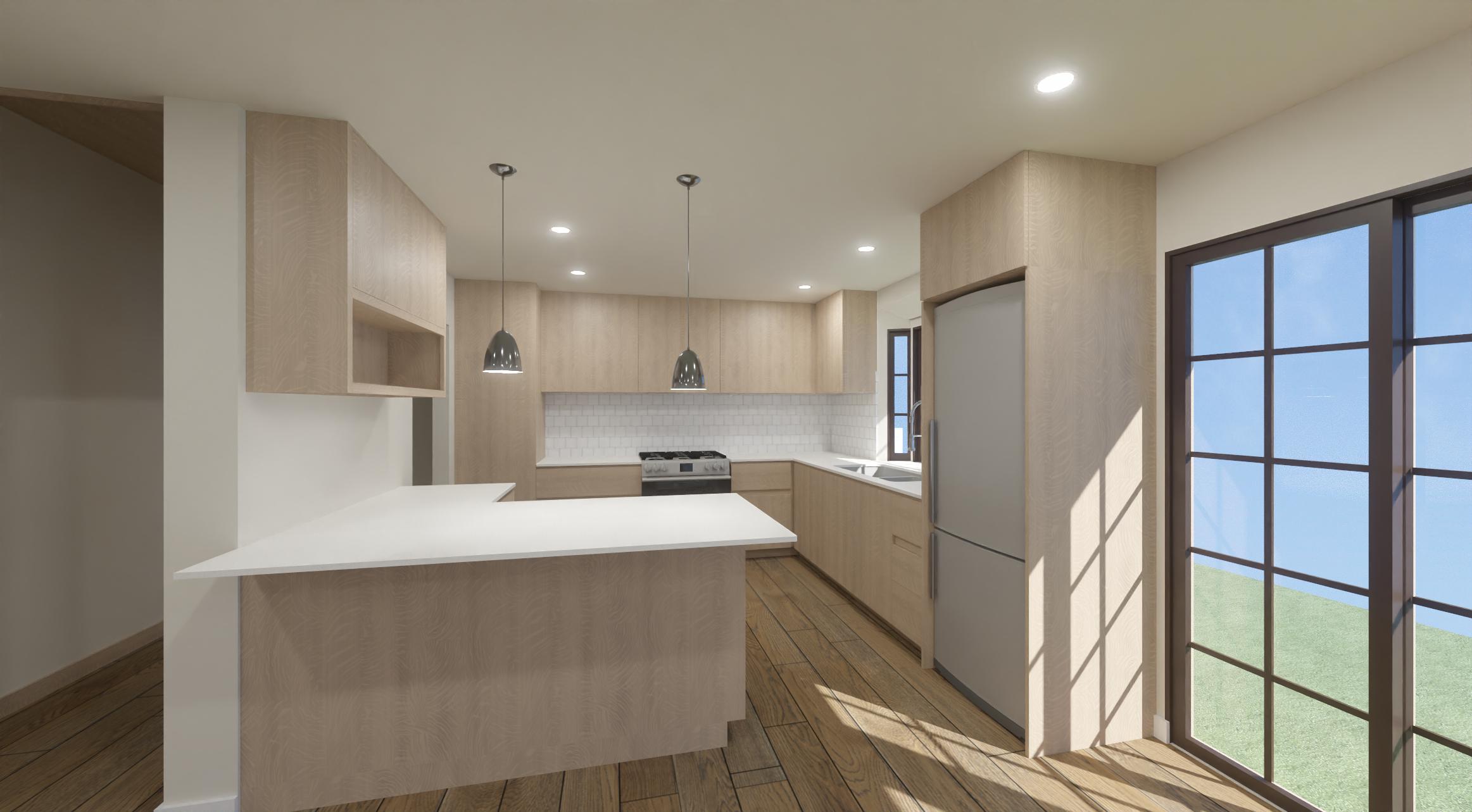 create a more realistic image for this kitchen with light grey wood grain cabinets on sunset lighting