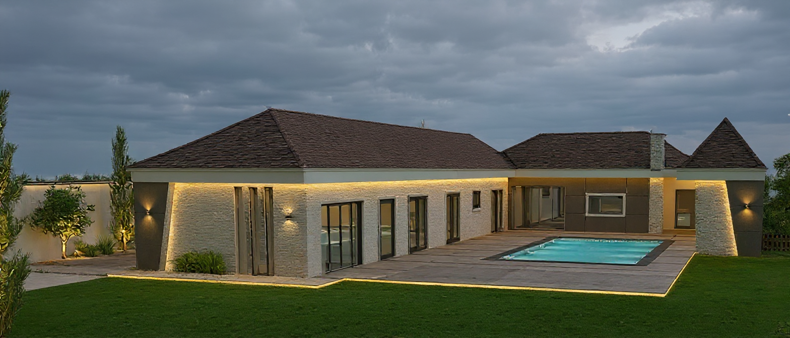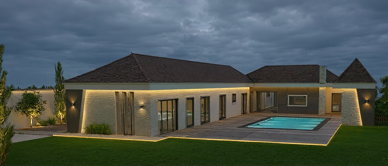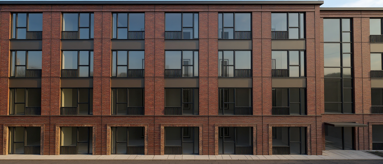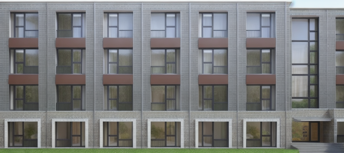 render a modern elegant apartment building glass windows reflecting the light nordic lights light indside building sunny day