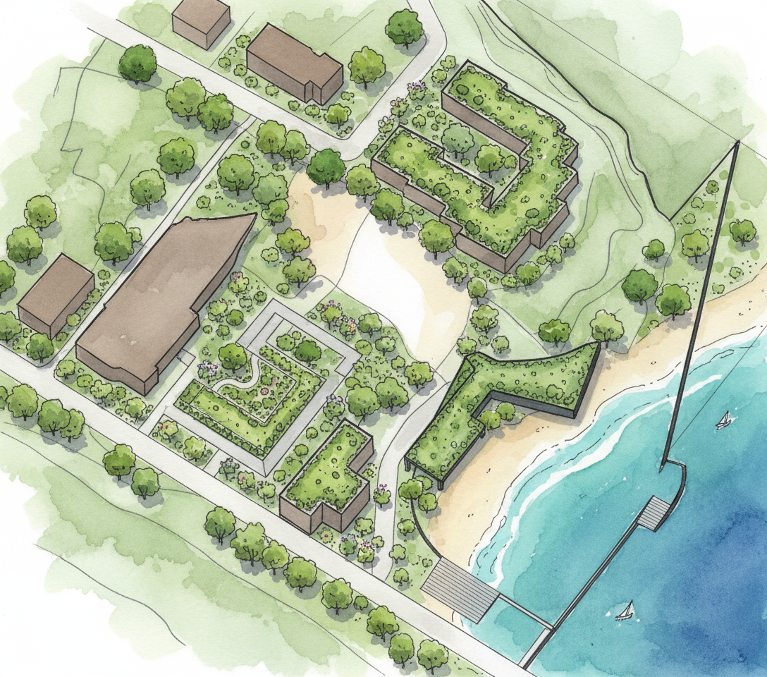 the dark roof is the only living roof with plants on top the elevated patio is acting like a seawall adjacent to the ocean and sand below at the bottom of the stairs only on the lower right side