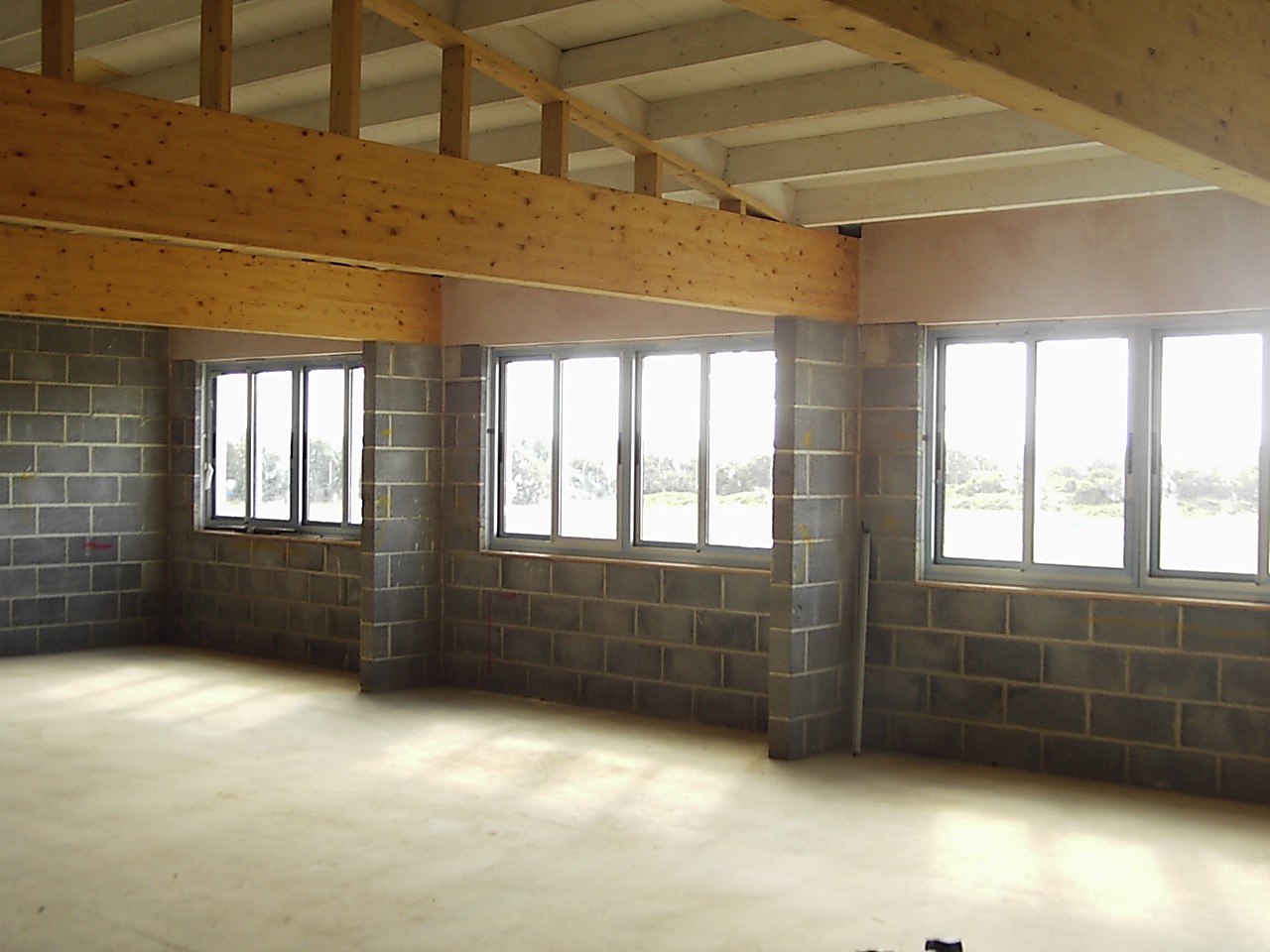 light grey painted block walls warm sunshine through the dark aluminium windows hidden ceiling lighting