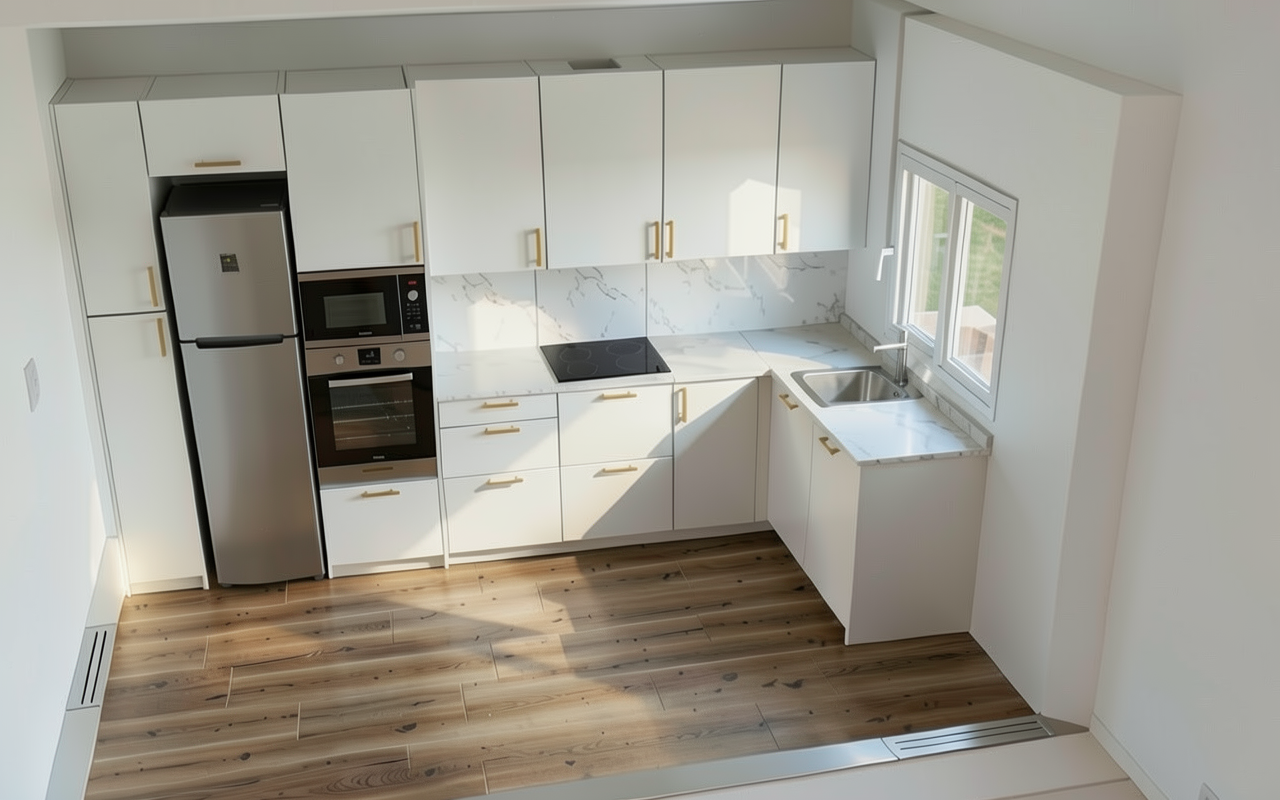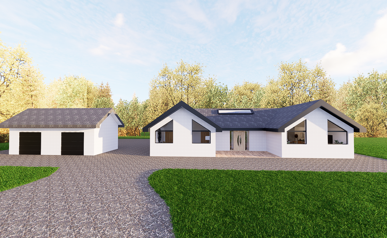 make this external shot of this bespoke home in the countryside look modern and realistic make it look like a nice summers day atmosphere with alot of natural light and golden glow make the grass look more vibrant but well maintained and the road in look more like a cobble road the house walls are to be white render and the house roof is to be dark grey slate tiles also add some guttering to the fascias and some external planters at the front of the building