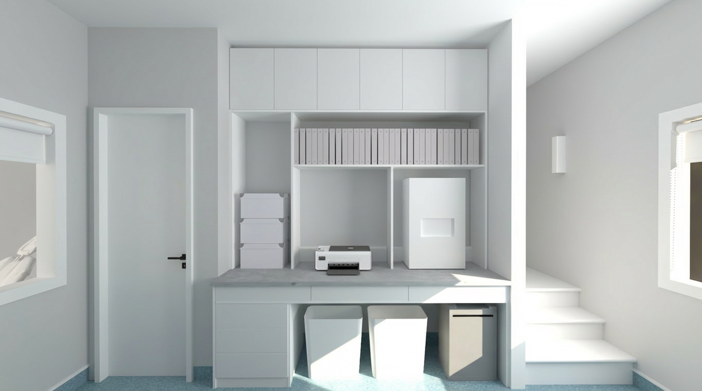 render of 3d model turn on lights in the book shelves indoor window looking into the living room