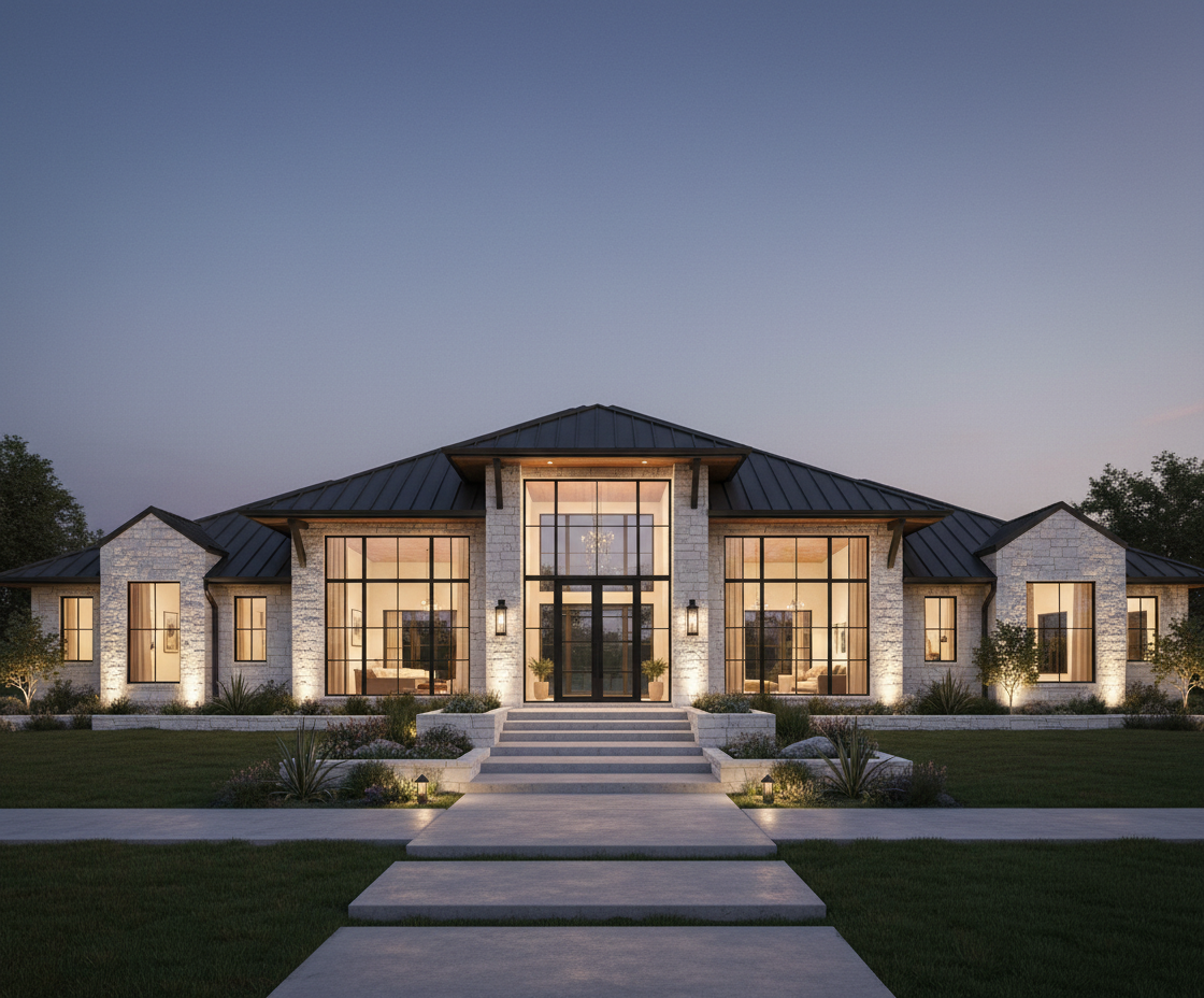 white limestone fa ade black standing seam metal roof steel framed windows