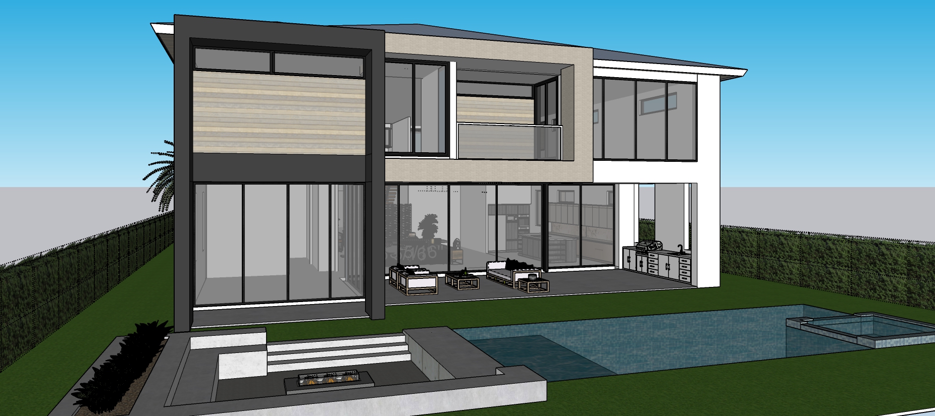 day blue sky with some clouds professional photography shot keep house layout structure and proportions please maintan the perspective image black metal roof add neighborhood high end housescan y