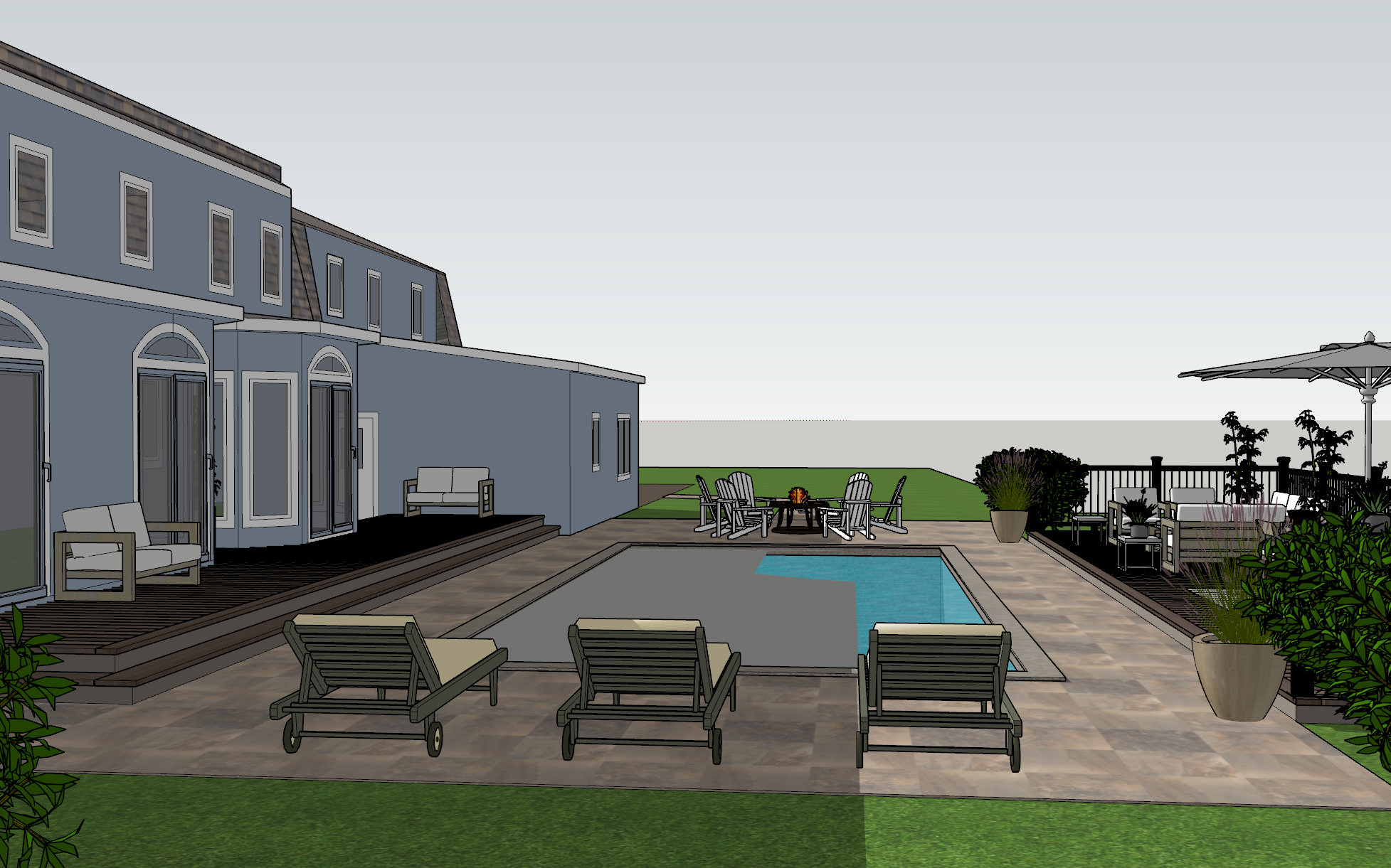 tree background porcelain tile patio light blue stucco house fire pit in center deck on right