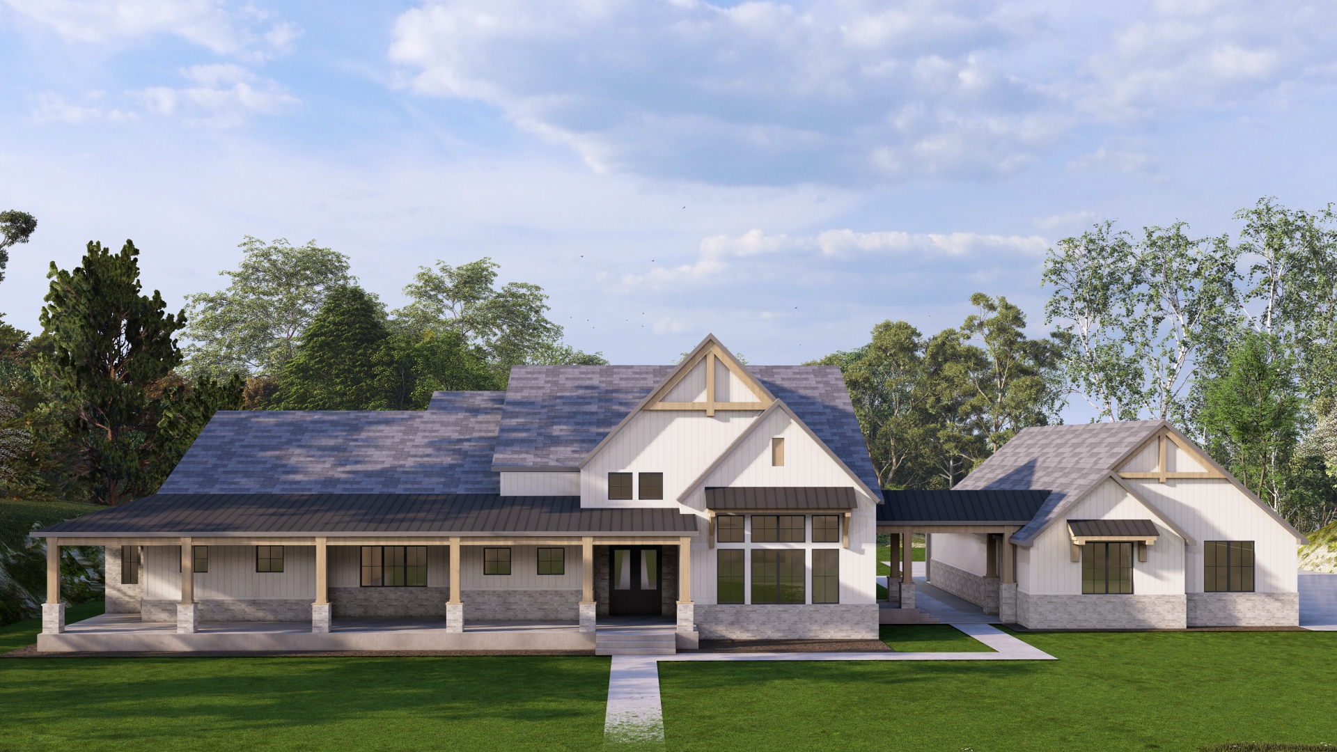 render a charming countryside house with a gable roof featuring light gray wooden siding and stone accents the roof is a soft slate blue with subtle shadows include a spacious front porch with a dark charcoal gray roof surround the house with lush vibrant green grass and a variety of tall trees in different shades of green the sky is a bright clear blue with light fluffy clouds creating a serene and peaceful atmosphere