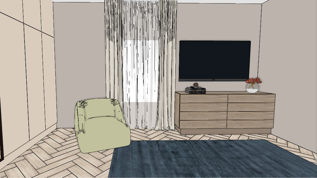 the rendered image should feature clean natural daylight as the dominant light source with soft diffused daylight entering through large openings the lighting should be well balanced avoiding excessive contrast or overexposure while ensuring that details remain clearly visible even in shaded areas the scene should also include 4000 kelvin interior artificial lighting the neutral white tone of this lighting should harmoniously complement the daylight the artificial light must not dominate the scene it should subtly enhance spatial depth and highlight material textures colors must remain accurate and natural with no color shift toward warmer or cooler tones the white balance should be neutral and the render should faithfully represent the original material finishes and shades the overall image should be clean sharp and photorealistic matching the original design as closely as possible in terms of composition proportions and material representation avoid excessive post processing oversaturation or stylization the goal is a realistic and authentic visual presentation correct the cabinet color to match the original image correct the image do not alter the original colors the cabinet should have a matte solid finish adjust the color of the cabinet under the tv to match the original image as closely as possible he cabinet under the tv should have a warm grey wood grain finish adjust it accordingly