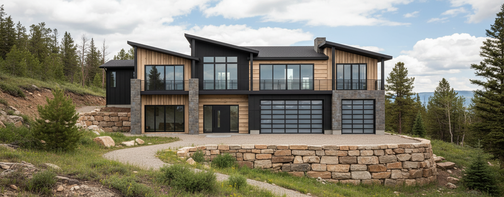 a mountain scape high end subdivision with an acre of property the lot is sloped and has a retaining wall out both side of the house driveway is out from the garage doors