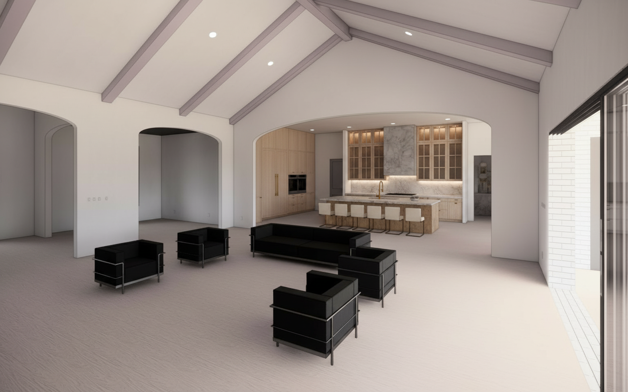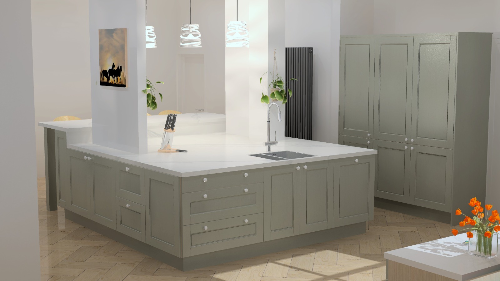 render a modern kitchen with a serene and elegant atmosphere the cabinetry is sage green with smooth matte finishes and white round knobs creating a sophisticated contrast with the sleek white countertops the kitchen island stands as a central feature with knife blocks and contemporary faucet the walls are painted a soft cream color enhancing the light and airy feeling warm oak wood flooring adds a natural cozy element to the space pendant lights with soft white glow hang stylishly over the kitchen island casting gentle illumination a painting of silhouetted camels in a desert sunset subtly decorates the column lush green plants bring freshness and bright orange flowers in a transparent vase add a vibrant pop of color overall the space embodies tranquil elegance with a touch of modern charm