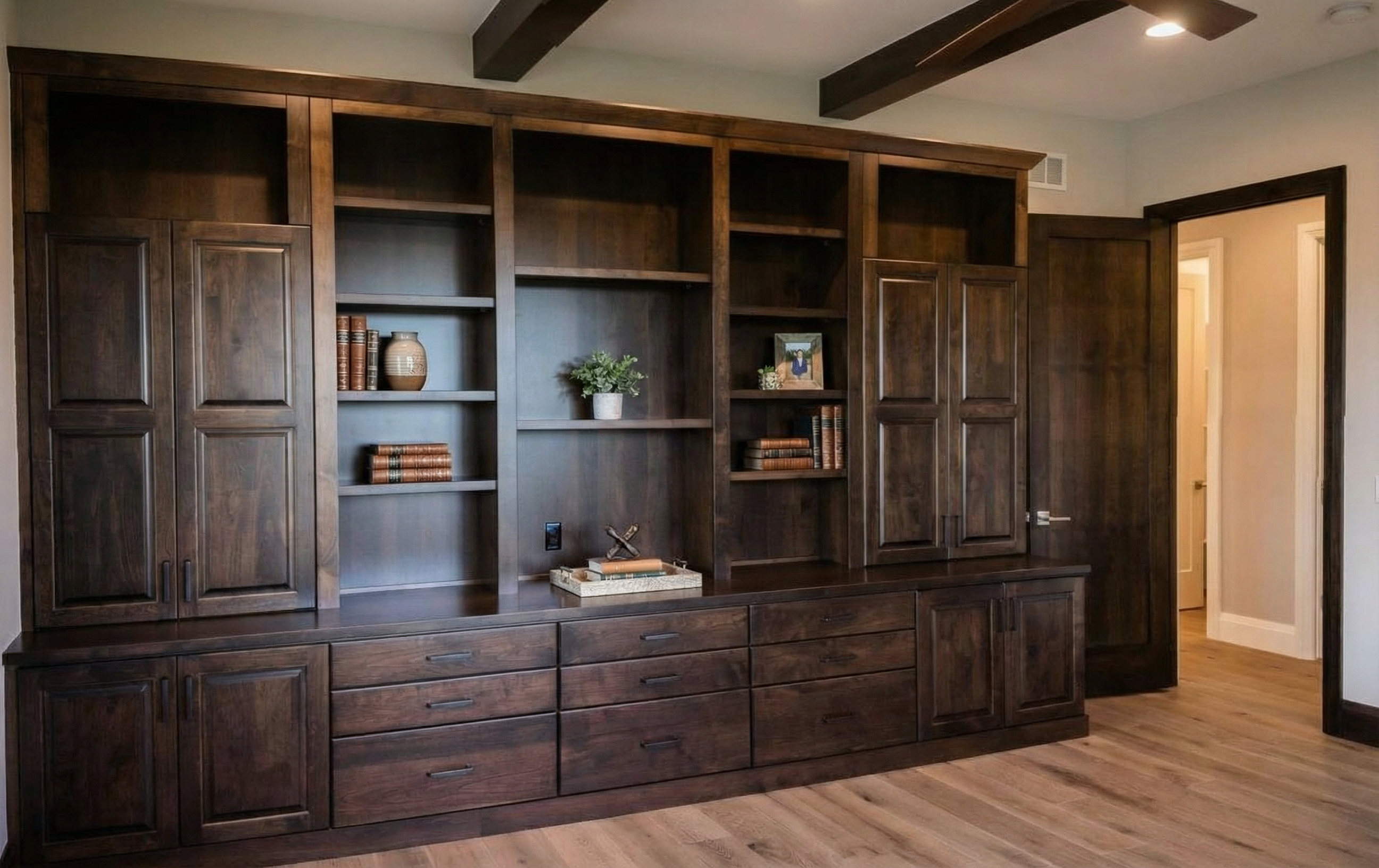 put a blue grey half height entertainment center across the entire back wall add a tv to the entertainment center furnish the room with furniture gold framed images molding and lighting