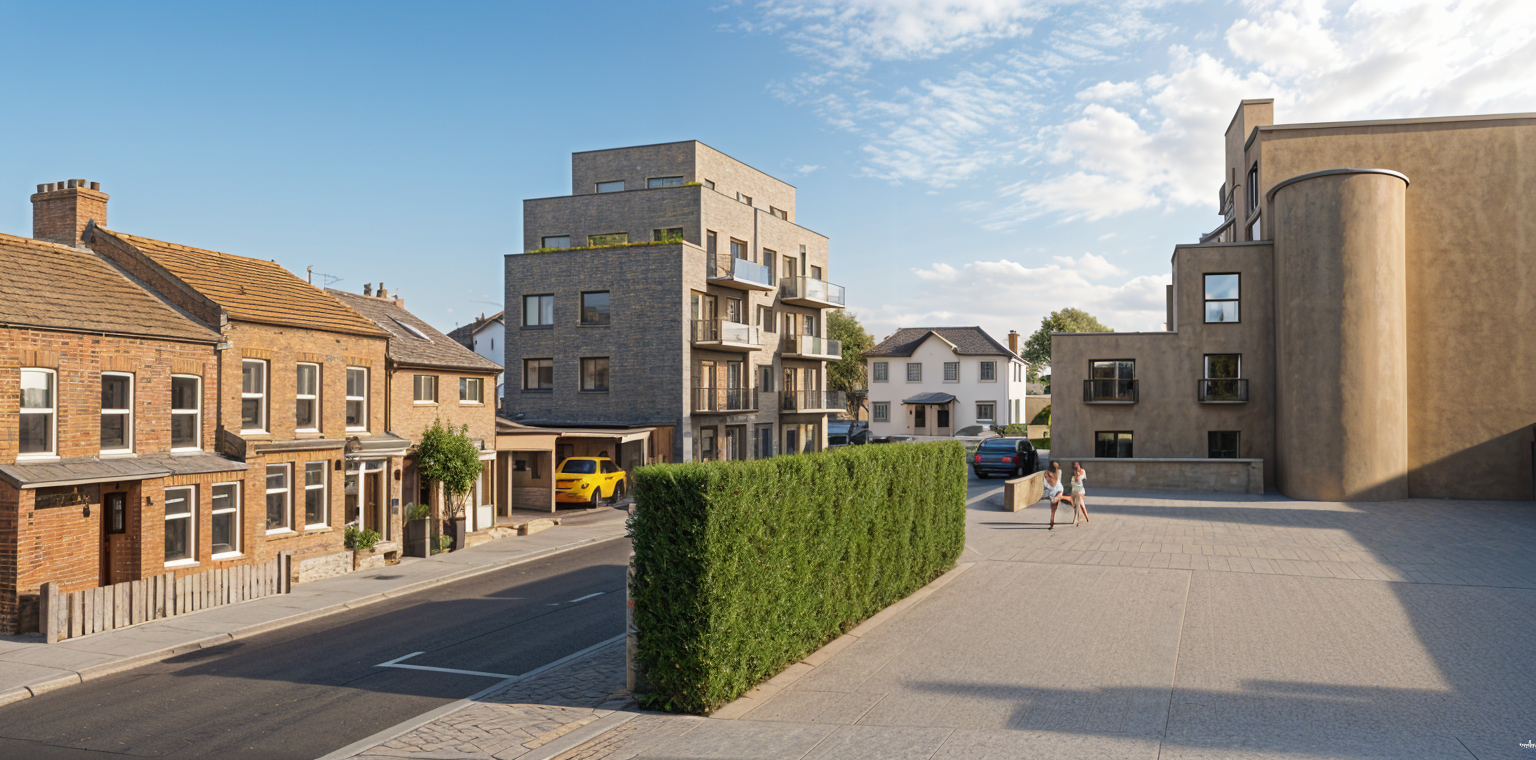 south london road add some people and a few cars with blue sky