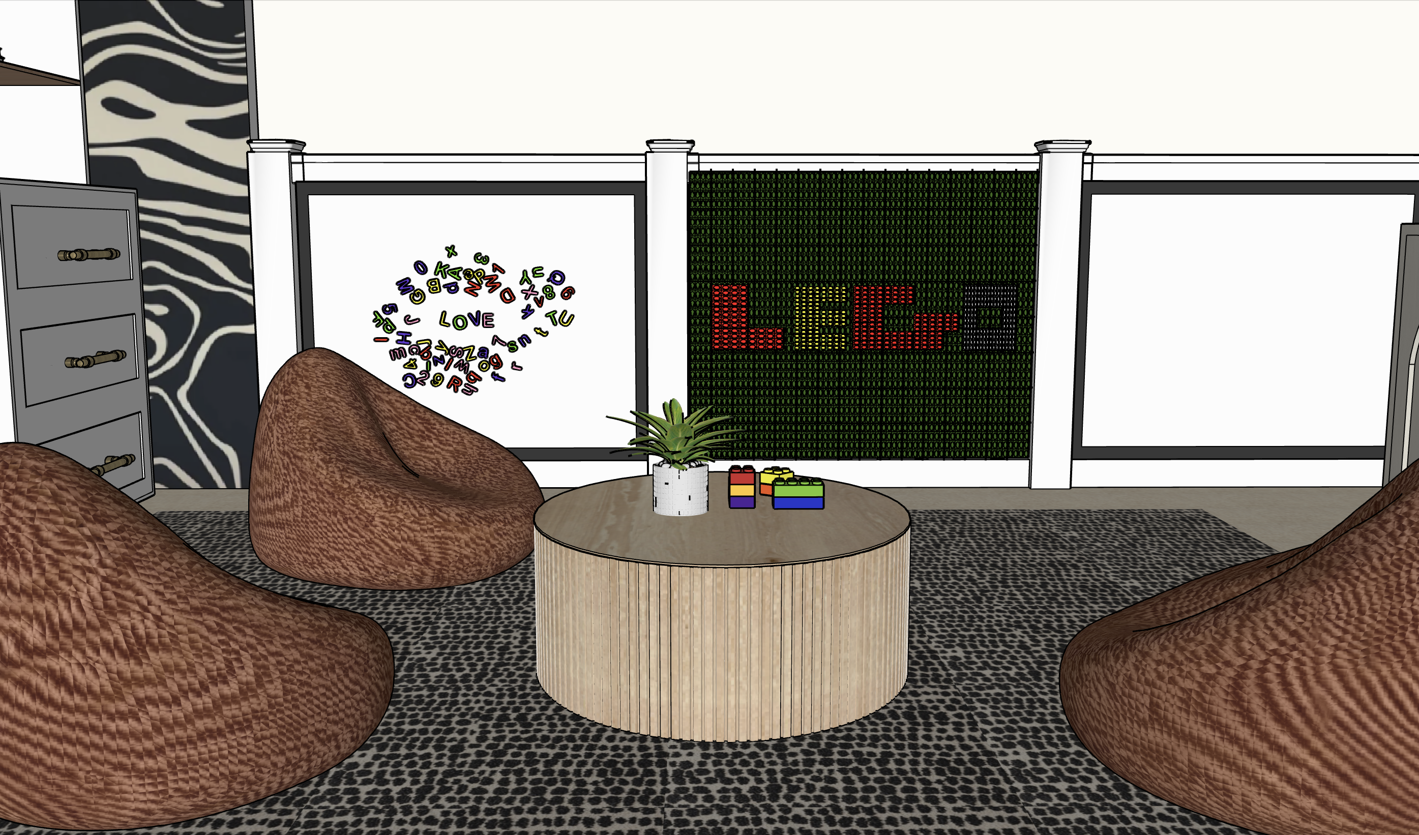 keep the layout the same but make the bean bags burnt orange corduroy there should be a plain white wall behind the banister