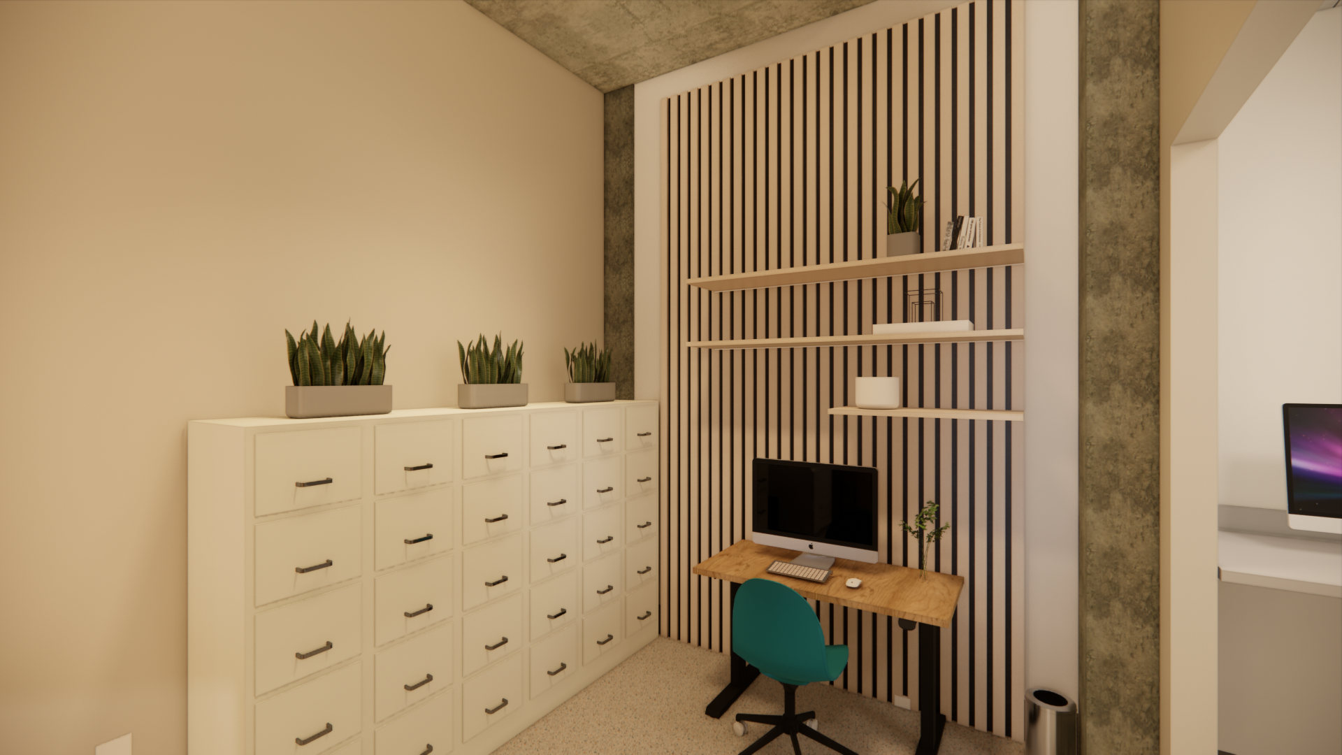 warm toned veterinary clinic admin space with a light white oak acoustic panel wall and exposed concrete support columns space has minimal access to natural light primary lighting is recessed downlight create a photorealistic interior rendering