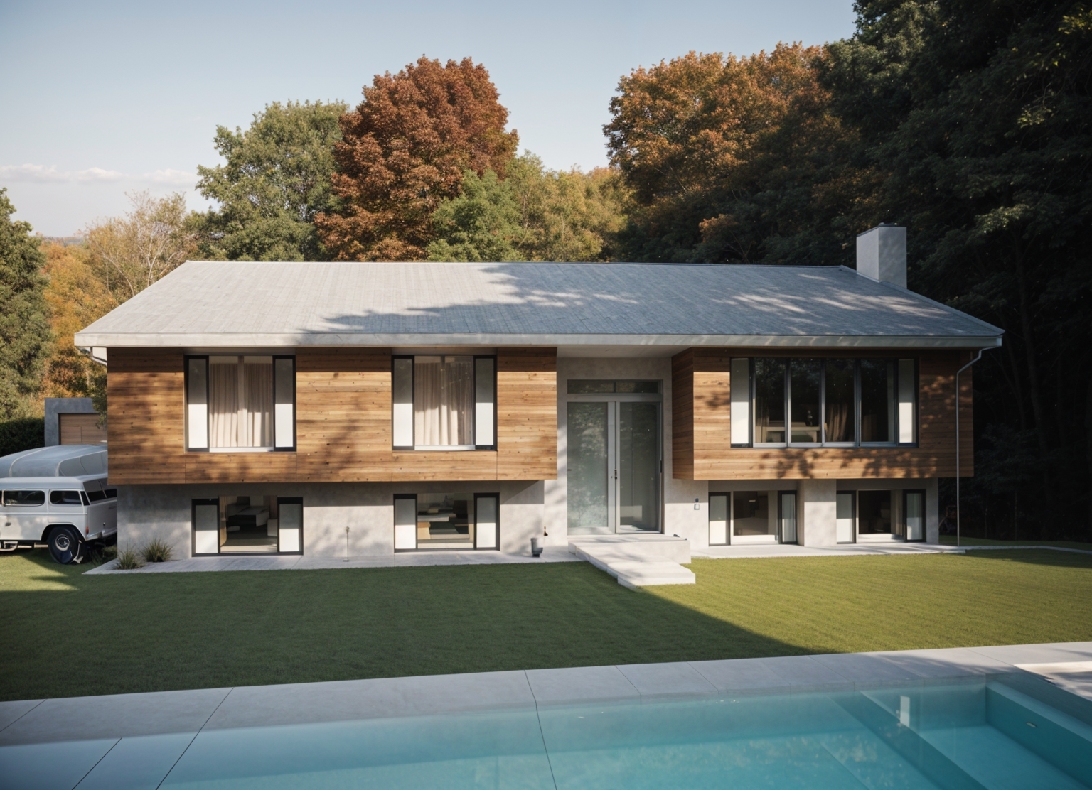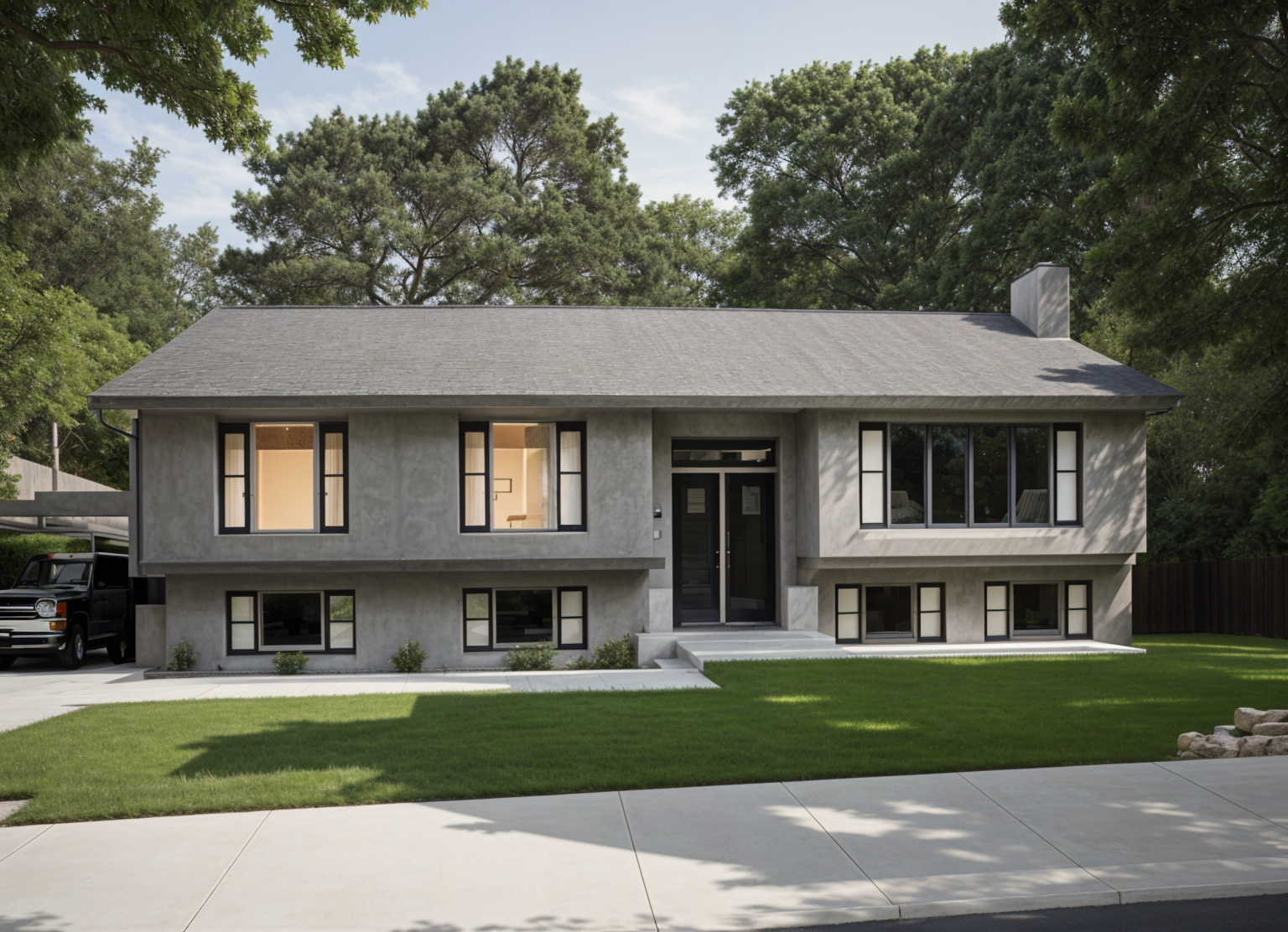 turn this 50s house in a more modern home with new front gables covered porch with columns show white siding and black metal roof architecture