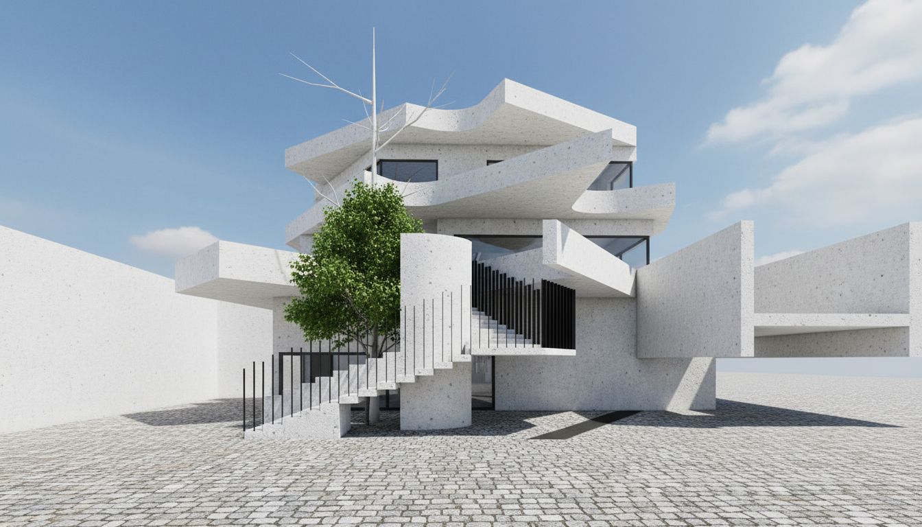 add light raw concrete panel texture on building add sky in the background add small cobblestone texture on the ground and a black car going in on the left side
