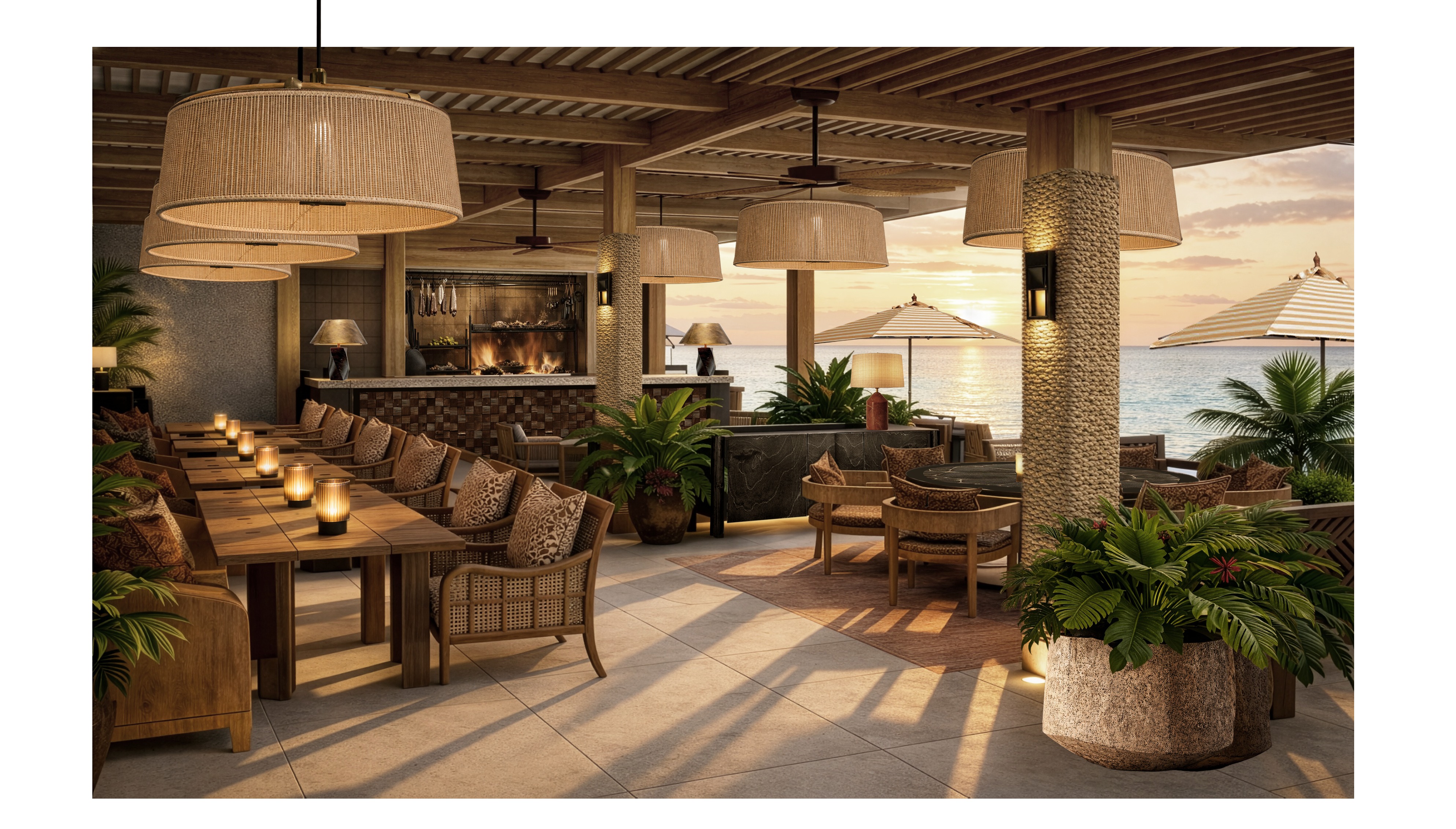 keep the lighting and colour temperature as it is make the lighting a little more sunset golden hour enhance the grill that is at the back keep everything else as it is make it photorealistic make the sky a little more crisp add clouds in the sky the wall lamp lighting should be softer