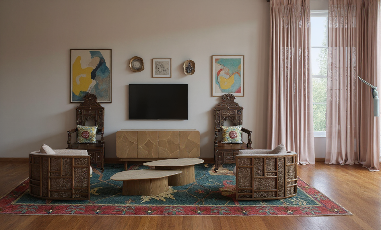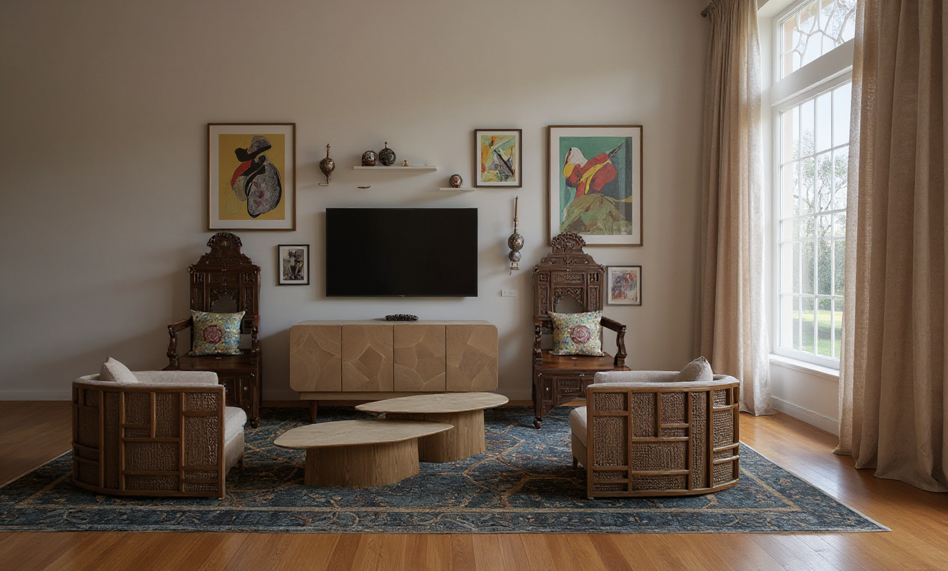 photo of a wood built bookshelf with floor to ceiling vertical wood filler panels each skinny wood filler panel has vertical ribbing wood base cabinets topped with a countertop support three open wooden shelves accessorized with minimalist neutral toned earthenware in harmonious brown to vanilla tones above the third shelf is solid wood panel extending to the ceiling creating a warm ambiance natural light floods the room casting soft shadows on textured surfaces japandi minimalism natural materials neutral color palette beige clean lines zen living room
