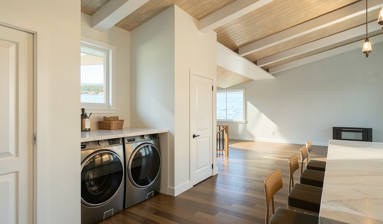 partly cloudy sky some deciduous trees in background white windows add gutters
