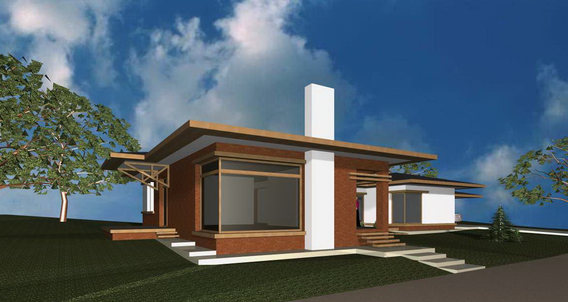 convert the image into a realistic outdoor photograph with professional architectural aesthetic maintaining 100 of the geometry and layout applying authentic materials afternoon warm lighting with soft shadows and a sharp photorealistic result add landscape design behind the building do not change material colors