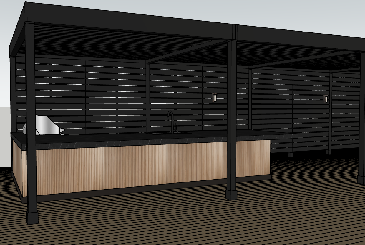 ultra realistic modern outdoor pergola with a matte black powder coated steel structure and black trim clean architectural lines black marble countertop with subtle natural veining soft polished reflection and realistic stone texture front of the bar clad in wood look matte fluted porcelain tile with vertical ribbed detailing natural tone variation and material depth horizontal slatted privacy wall in matte black finish with subtle surface texture integrated wall sconces casting gentle architectural shadows across the slatted wall timber deck boards with realistic wood grain slight tone variation natural spacing and soft weathered texture bright natural daylight with soft diffused lighting realistic hdri sky illumination physically based rendering global illumination ambient occlusion realistic shadow softness architectural photography eye level perspective 35mm lens shallow depth of field balanced exposure true to life colours photorealistic high detail 8k resolution no furniture no led strip lighting no dramatic sunset lighting no redesign of structure