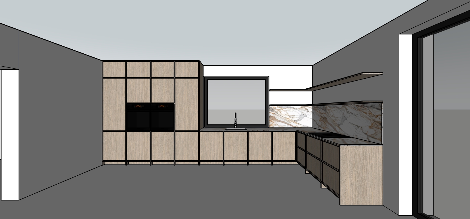 render this kitchen addsome trees in the window and decorations on the shelf finish this scene