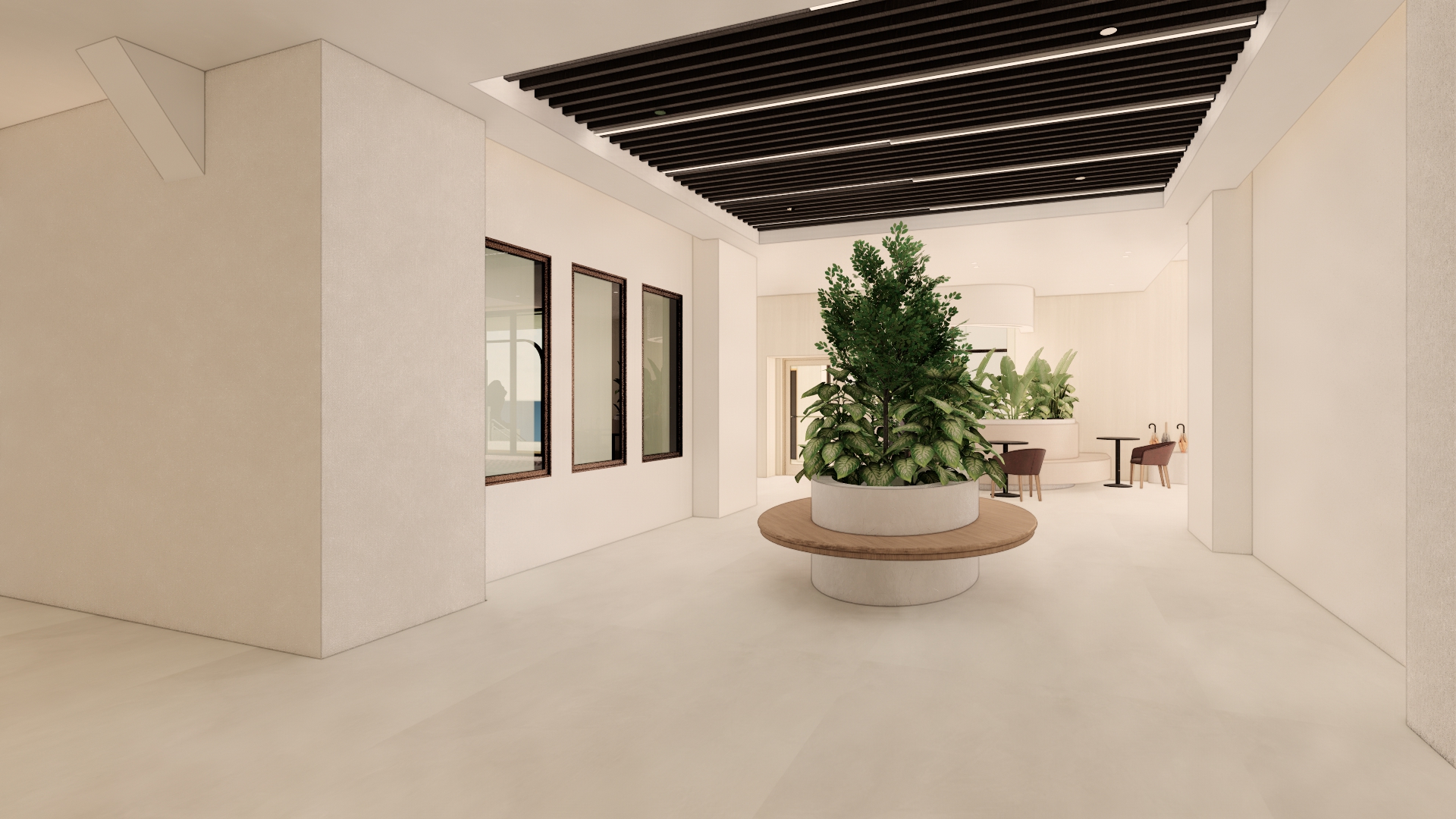light matte marble floor and plaster walls add people seating at wood bench around planter keep all lighting and funiture as is