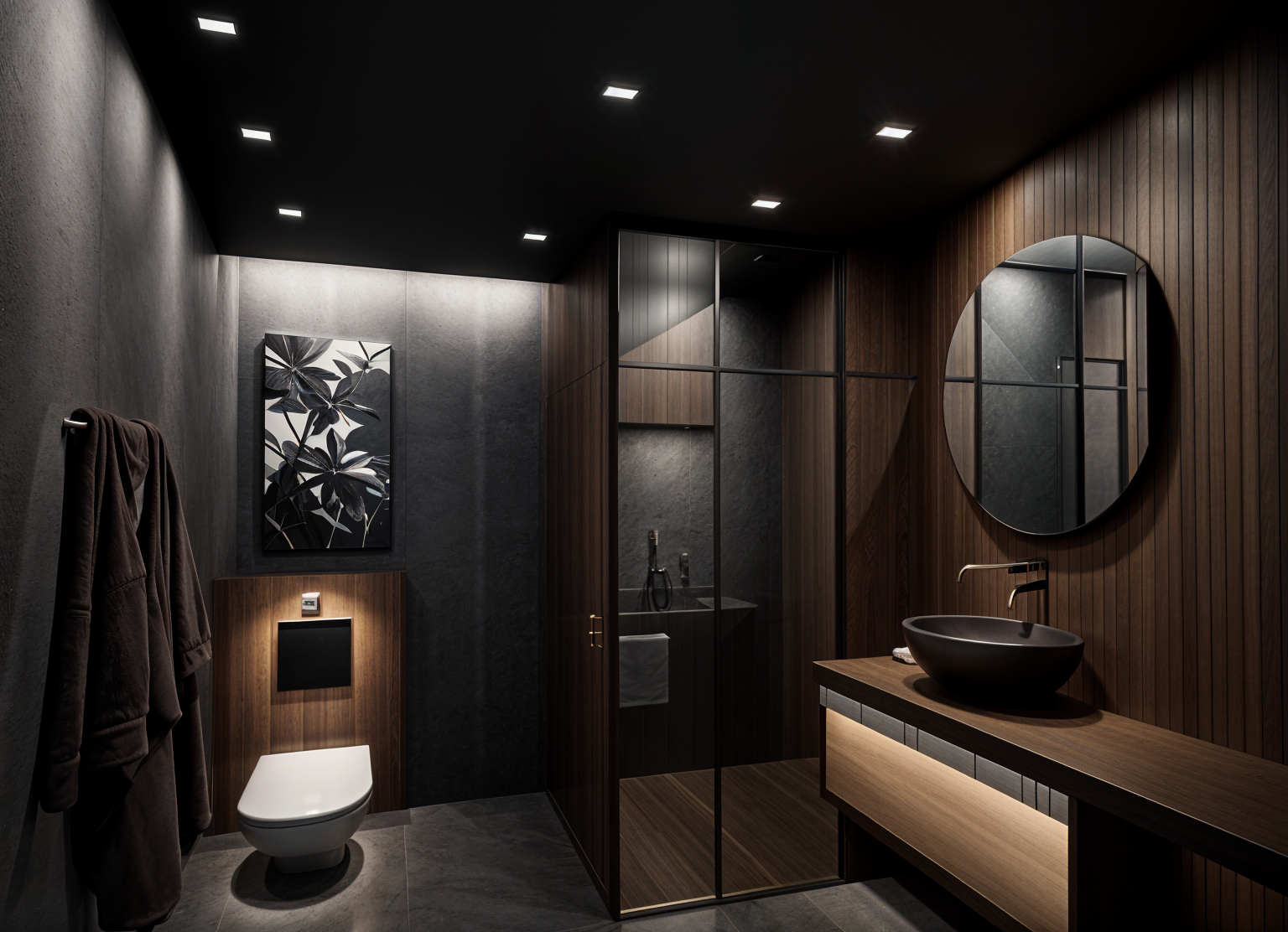 interior room with soft ambient lighting featuring a light beige chevron patterned wooden floor a comfortable beige armchair and a round wooden coffee table the walls are painted in a warm off white with gentle recessed lighting illuminating built in shelves a large skylight above casts natural light enhancing the tranquil atmosphere french doors open to a lush garden with vibrant green leaves and colorful flowers the overall mood is peaceful and serene with a blend of natural and soft neutral tones