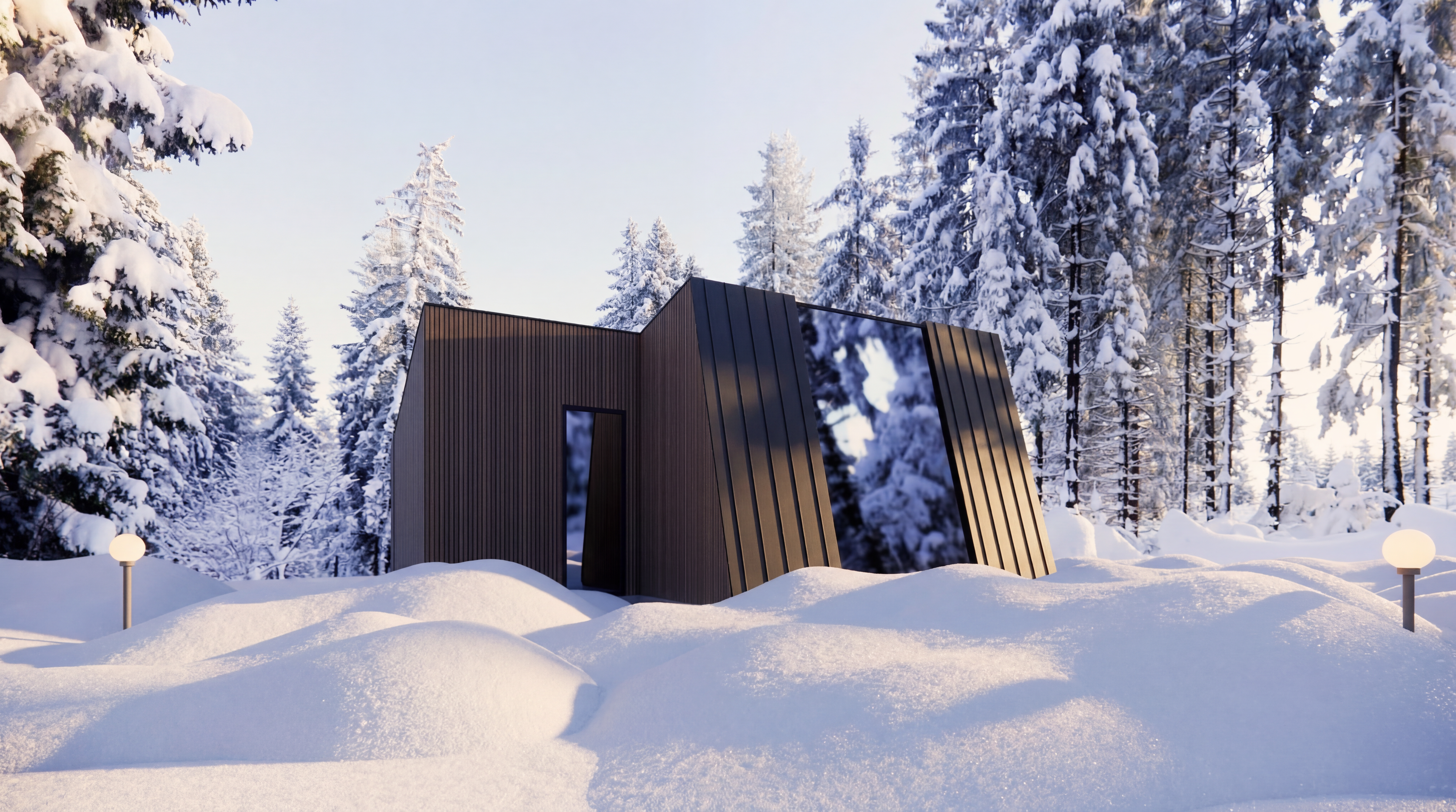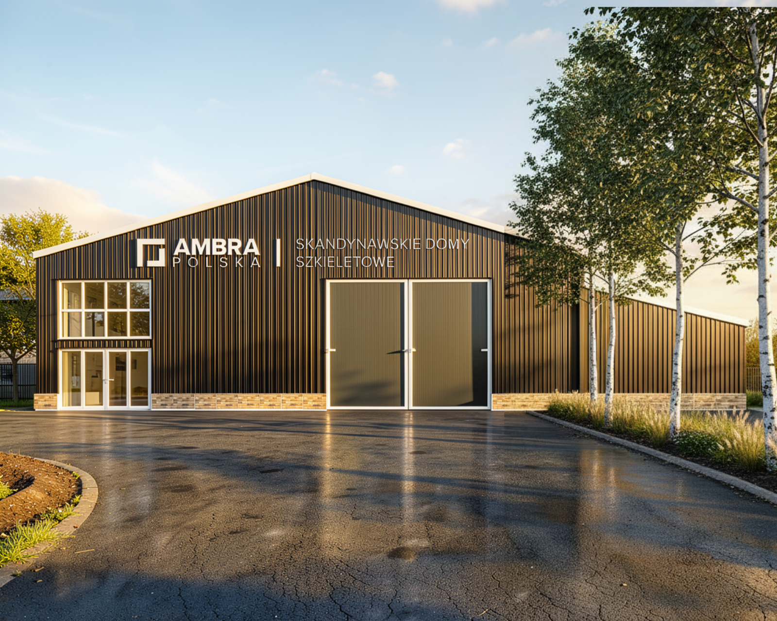 replace the entire facade with narrow horizontal black panels do not change the layout of the windows doors or the structure of the production hall