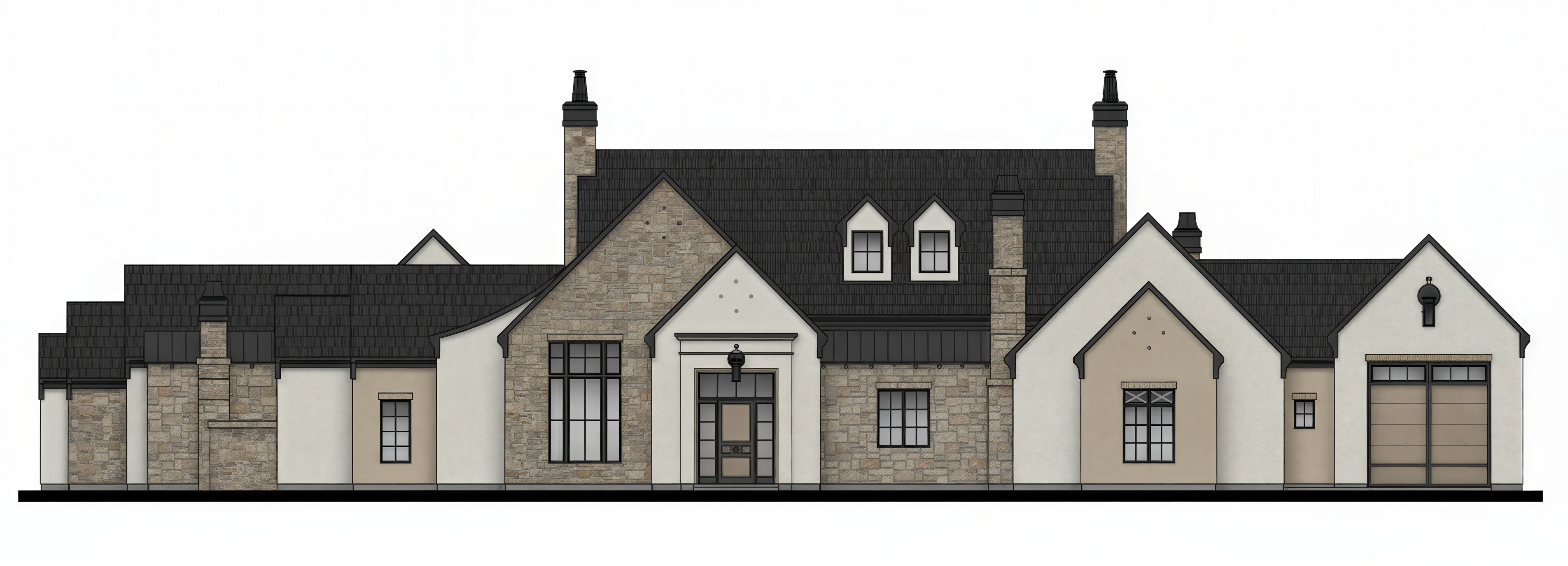 the roof is a black slate tile roof the areas that have a stone pattern should be a berkshire rubble from soltice stone and the the walls with brick should be a birch or a tan color the walls that are blank should be a smooth stucco look at the details the walls on the left side stagger the are moving towards the back of the house its not one long row it has staggers so make sure to adjust for that the roof lines will make that clear the should go back about 10 feet every harsh roof line there are metal roof sections so pay attention to that the window trim is all black the garage door on the far right is an rv gargage the pony wall the firepace to the left is a smooth stucco with a brick layer on top