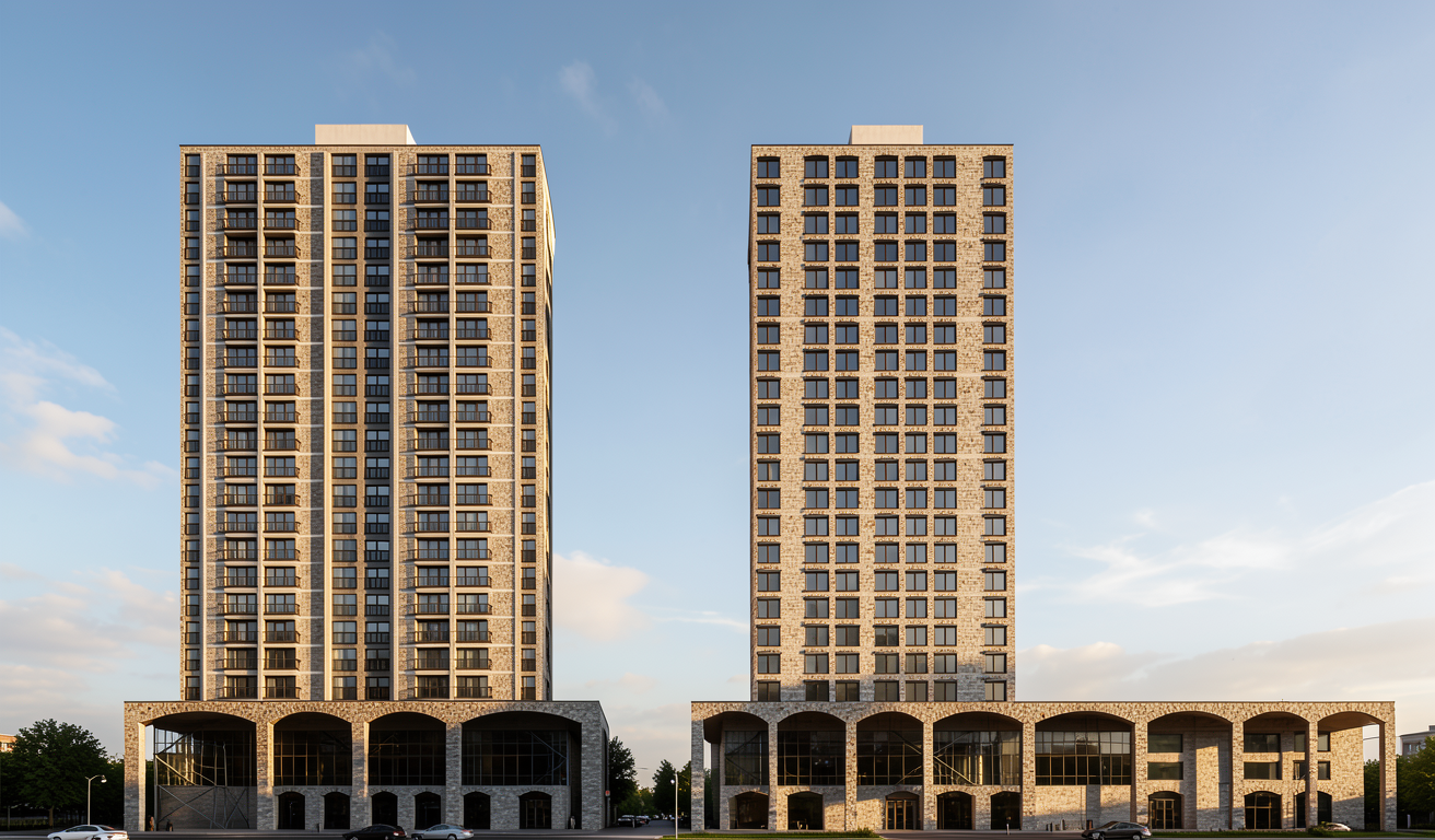 important preserve the existing geometry and the existing context exactly as provided do not modify alter reinterpret add remove scale or reshape any geometry do not change the site surroundings street layout neighboring buildings vegetation or context elements do not modify geometry scale proportions buildings road layout sidewalks or surrounding context in any way do not change text photorealistic architectural rendering clean and balanced contrast calm cinematic mood style contemporary european residential architecture minimalist premium understated delete all people do not add any furniture inside and light fixtures delete all people soft sunny noon atmosphere diffused natural daylight with subtle blue grey tones cinematic architectural mood large glass surfaces with realistic reflections soft mirror effect subtle environmental reflections of sky and surroundings high dynamic range lighting realistic global illumination soft shadows calm and minimalist nordic mood photorealistic architectural visualization balanced exposure no harsh highlights warm interior lighting 3000k glowing from inside do not change the garage door