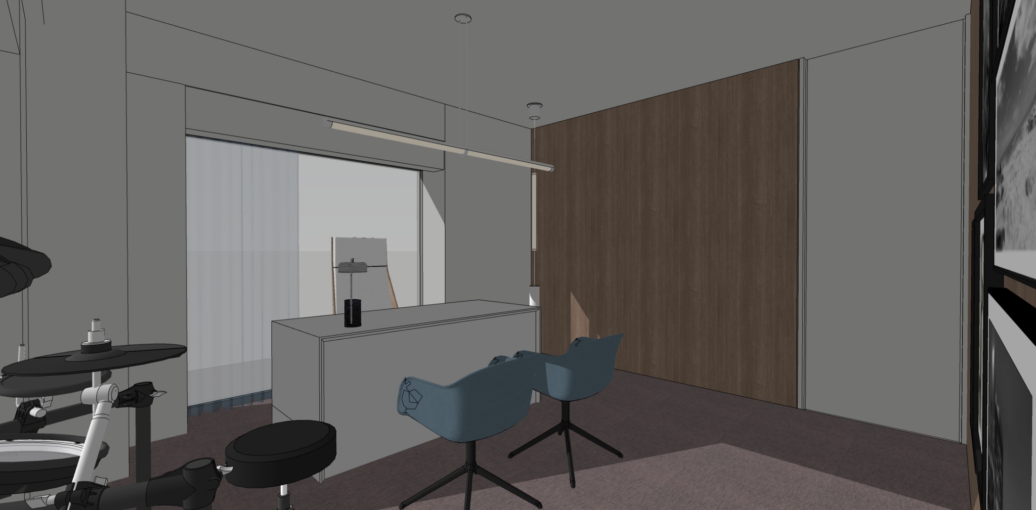 render a minimalist modern office room with a sleek stylish atmosphere use soft beige and walnut wood accent for the walls to create an open airy feel illuminate the space with warm natural sunlight filtering through large translucent windows along with a curtain a side add a modern electronic drum set in matte black positioned beside a aqua blue chair with a charcoal gray table include one mid century modern office chairs with light wooden accents and polished metal bases decorate the walls with black and white landscape photographs use a grey mahogany carpet to ground the space ensure the lighting creates a calm productive environment