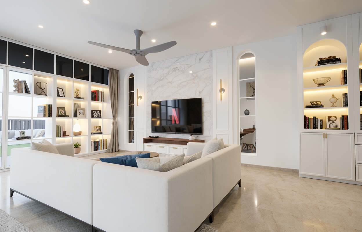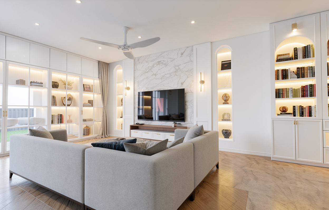 glossier floor decorated solid white bookshelf add led lights inside the cabinets of bookshelf do not change the color of original feature wall 2 boards under the wall lamp is grey
