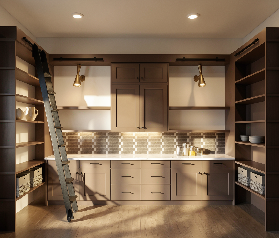 make this interior elevation look realistic cabinet color is a light wood soft lighting
