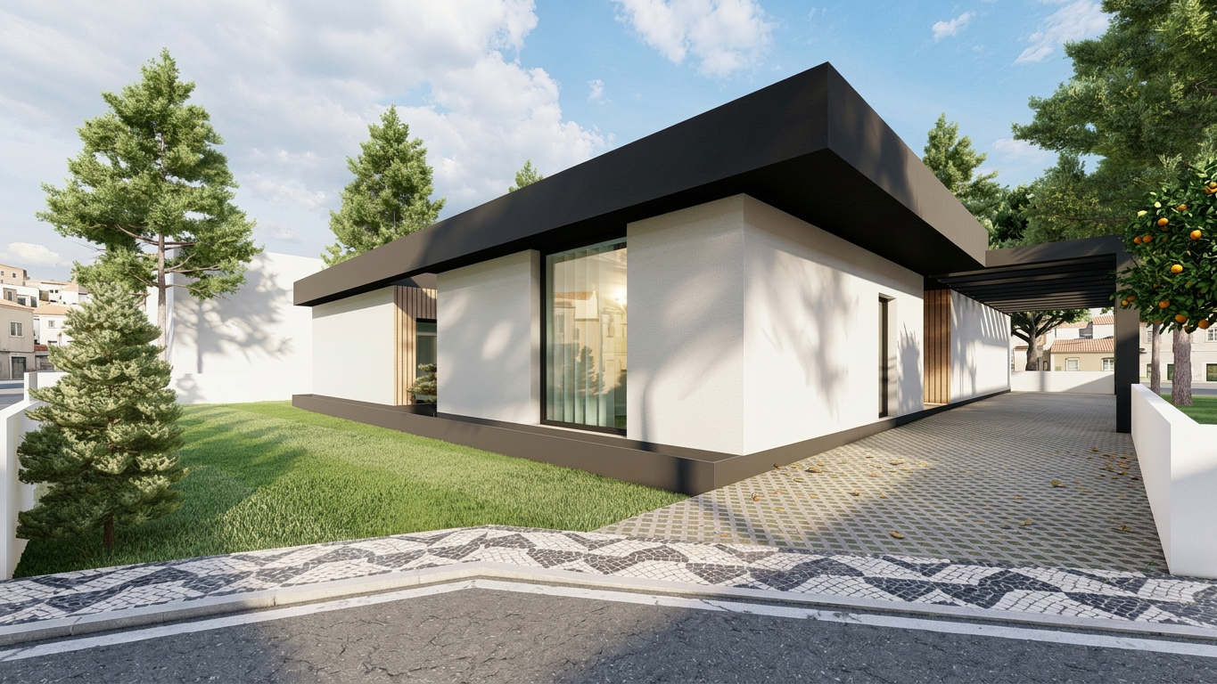 facade is light beige color with red brick roof windows and doors are new and white there is metal rail and remove furniture in the picture