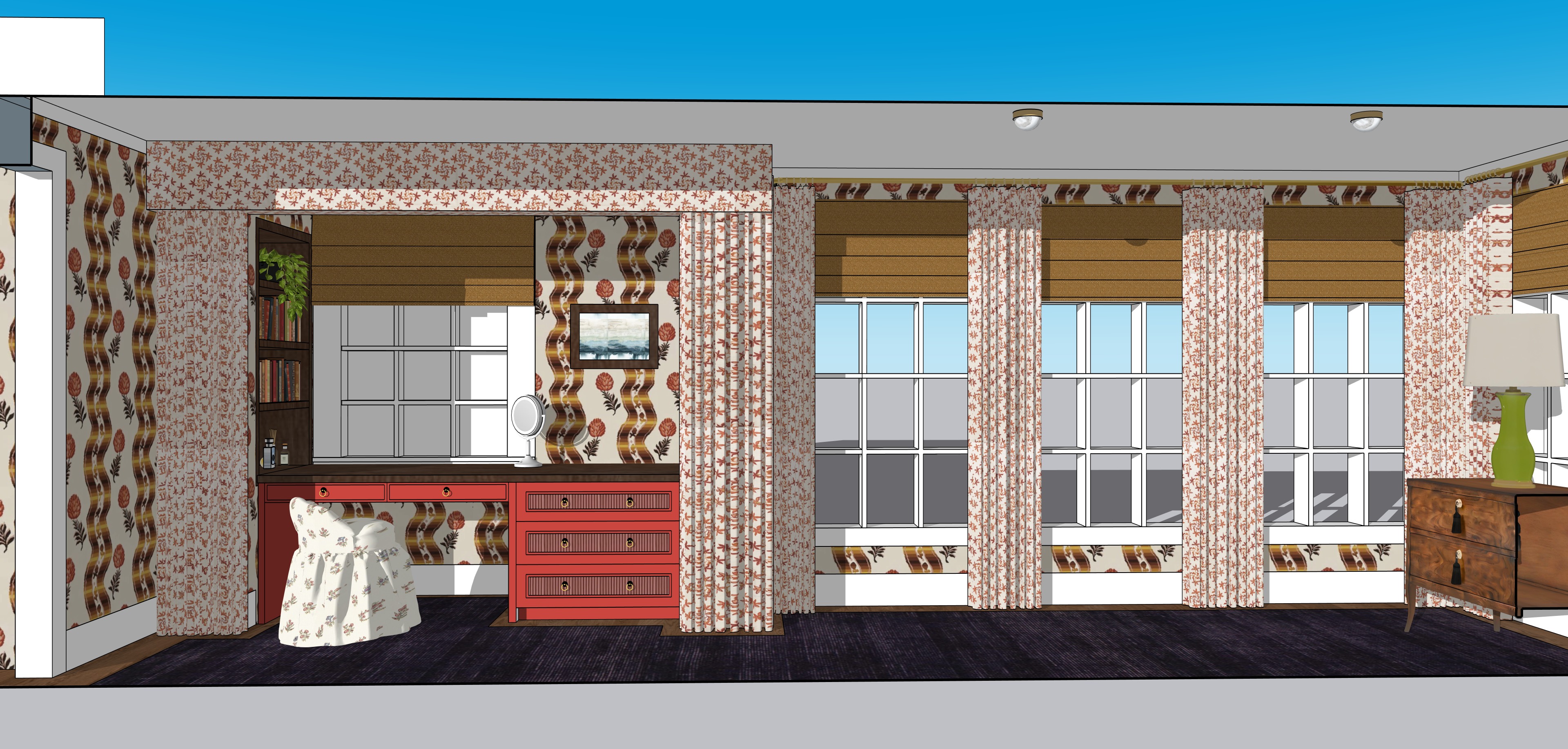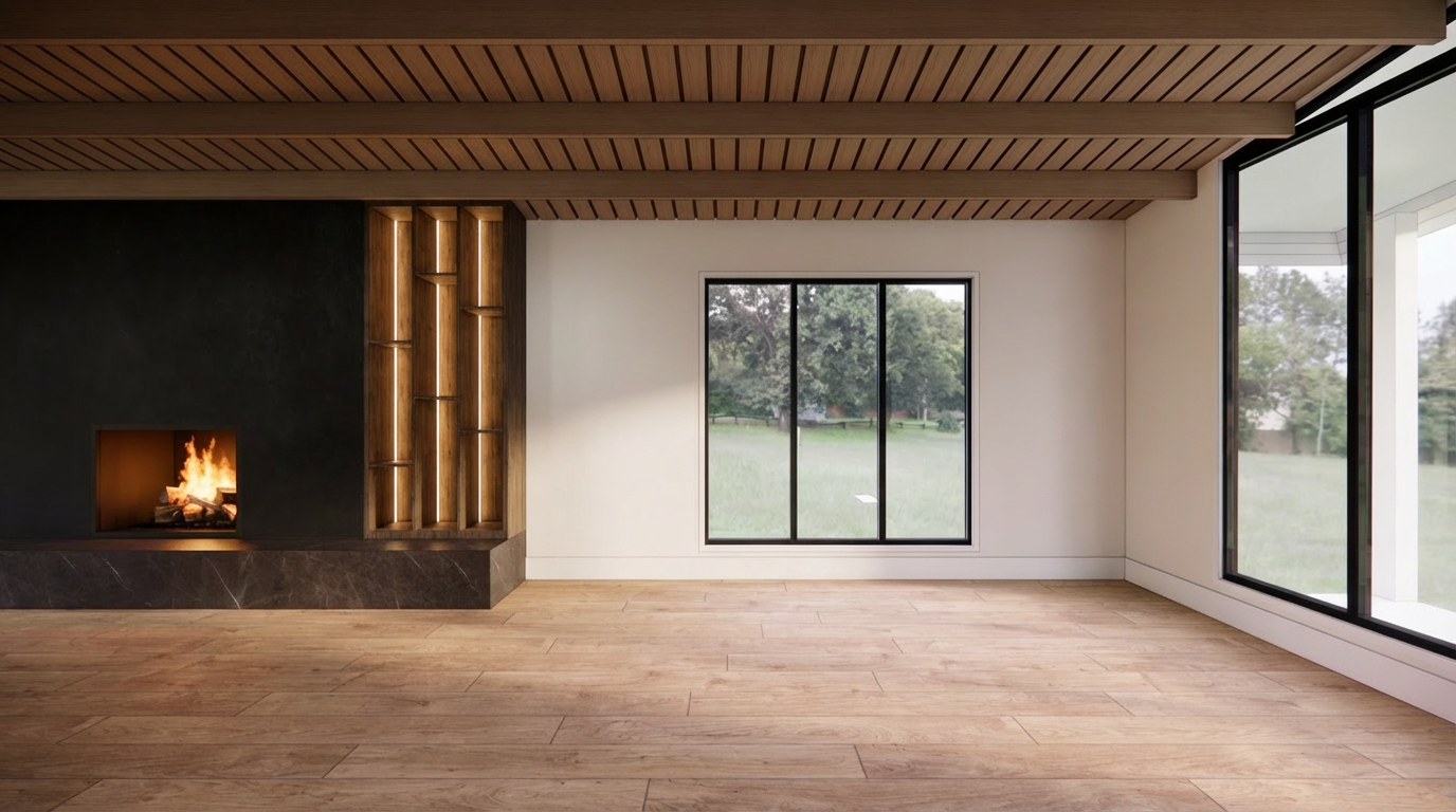 the uploaded image is a finished sketchup interior scene with final materials already applied preserve the camera angle room layout and furniture placement exactly as shown all materials must remain unchanged including the fabric the upholstery the rug the fireplace surround the mantel and the wood flooring do not reinterpret fabrics colors or textures enhance the image by adding realistic lighting shadows and material depth only to create a photorealistic architectural rendering strict preservation keep all fabrics patterns colors and materials exactly as shown material fidelity required