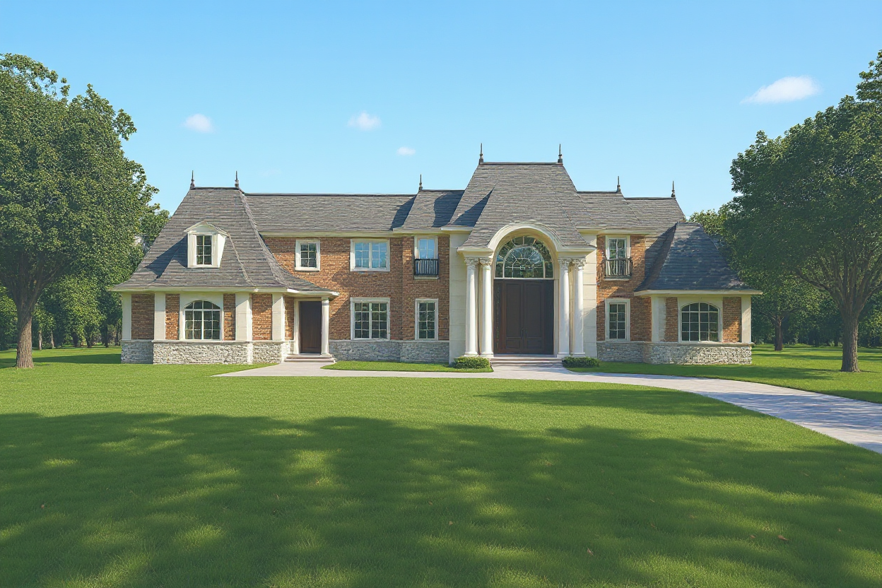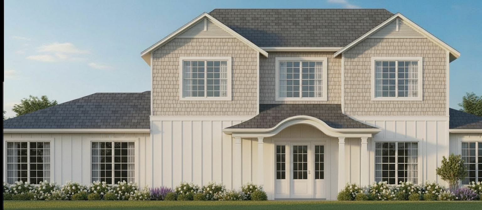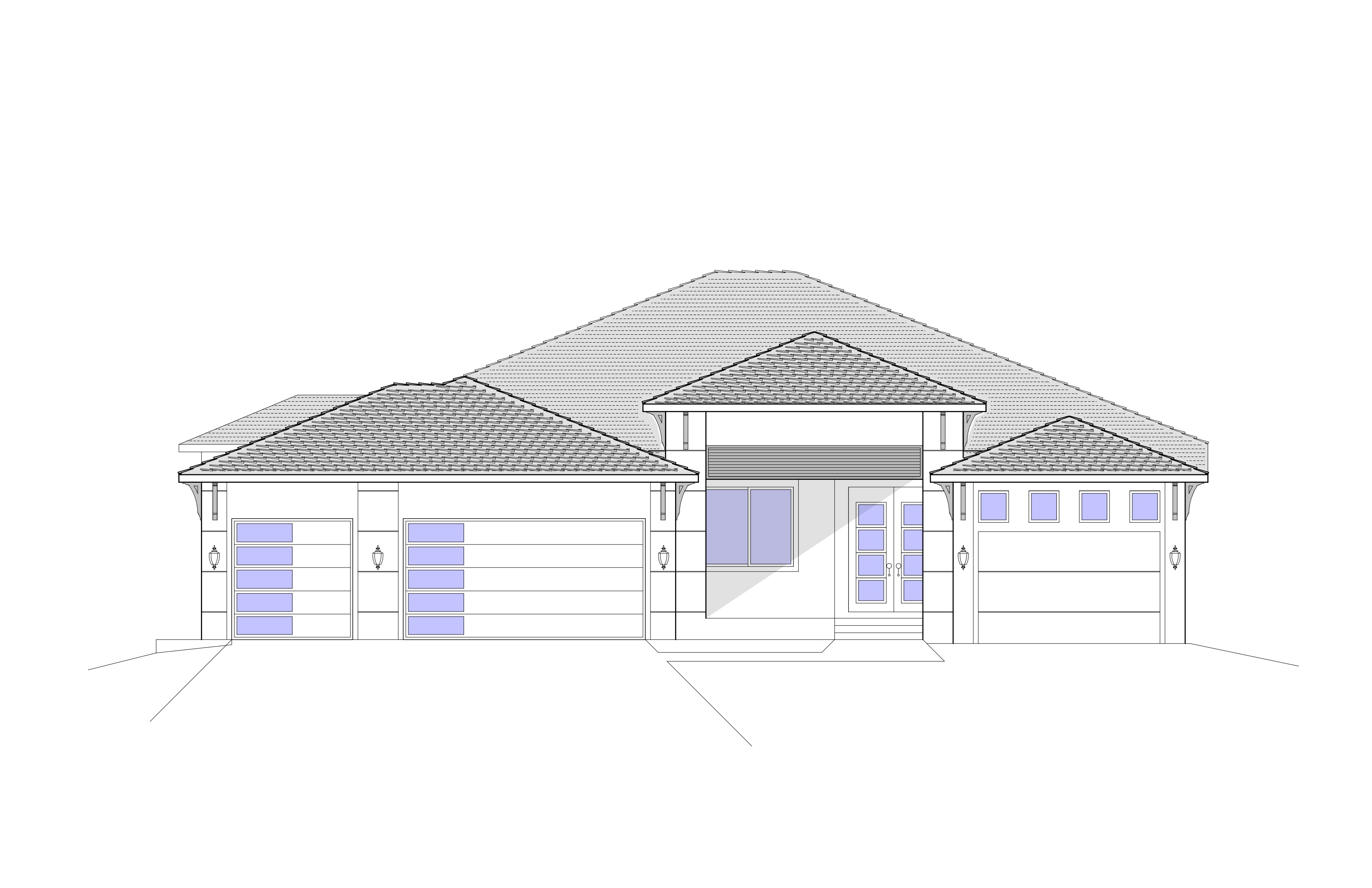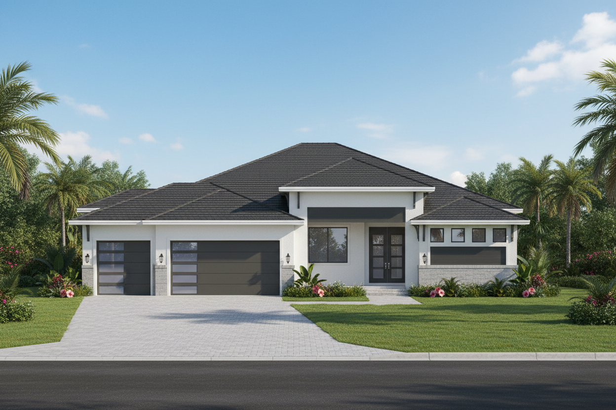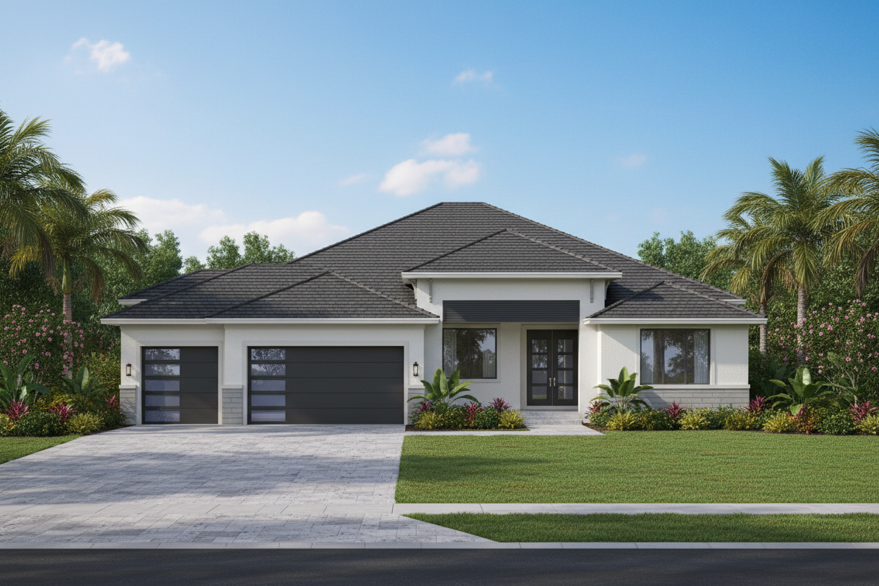 dark gray flat tile roof white fascia and soffit white walls dark gray garage doors dark gray entry doors light gray banding dark gray shutter across entry grass yard with tropical landscape blue sky with clouds large dappled gray paver driveway and walkway to entry driveway extends to edge of the road