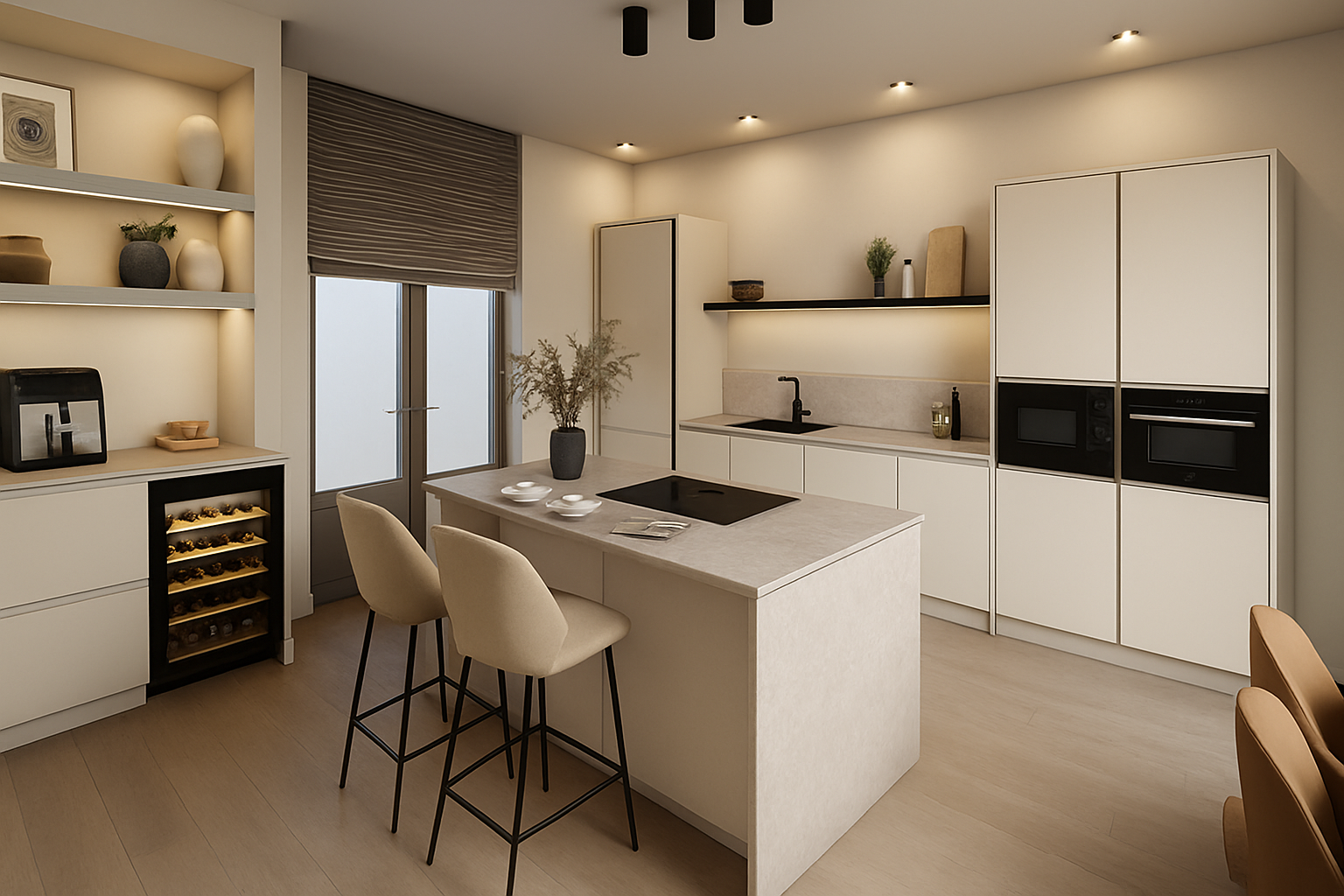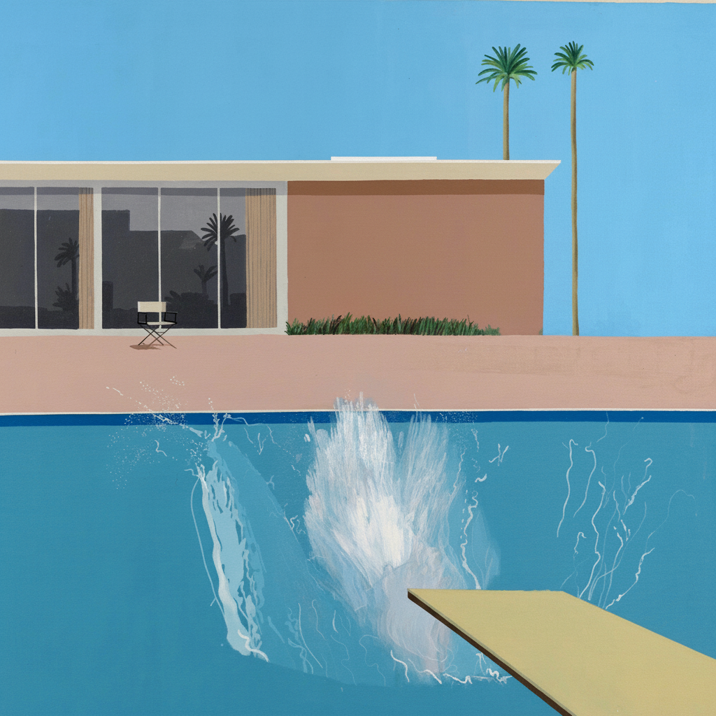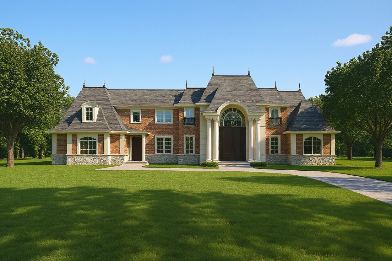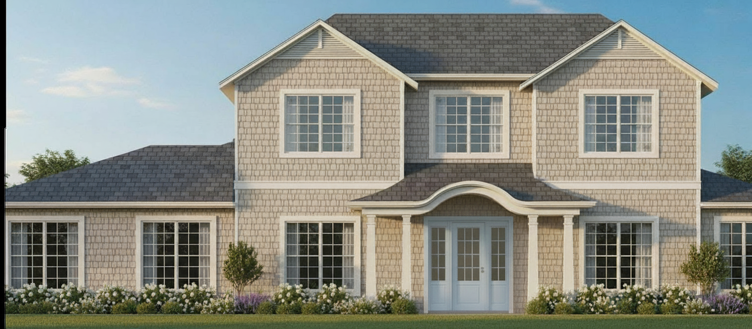 dark gray flat tile roof white fascia and soffit white walls dark gray garage doors dark gray entry doors light gray banding dark gray shutter across entry grass yard with tropical landscape blue sky with clouds large dappled gray paver driveway and walkway to entry driveway extends to edge of the road