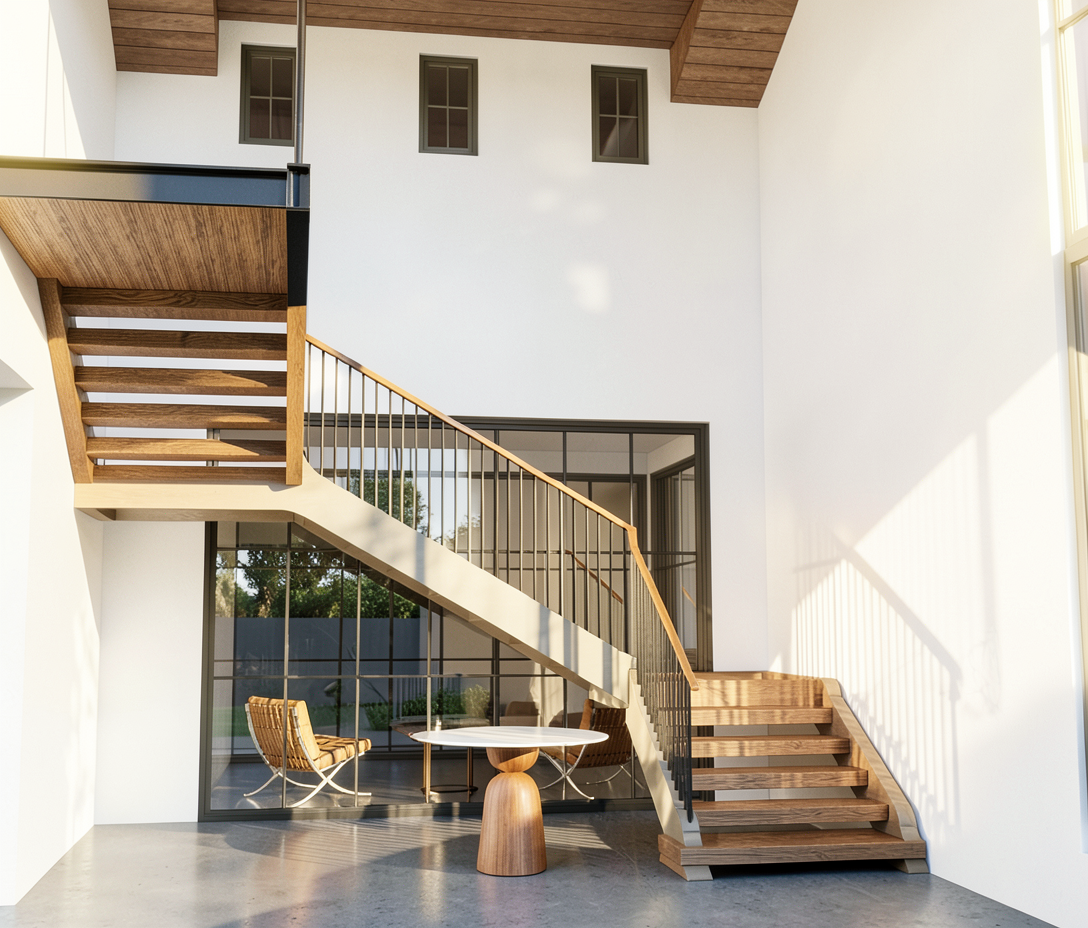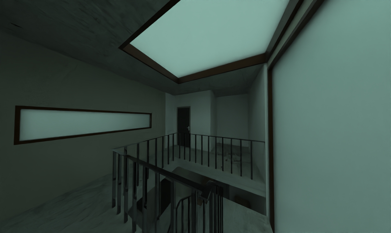 imagine ultra realistic architectural interior rendering of a two story accessory dwelling unit adu interior stair void and upper landing view minimalist tropical modern architecture monolithic plaster or concrete walls with expressed thickness sculptural stair carved from a solid mass simple dark metal railing with vertical balusters enclosed stairwell emphasizing verticality large recessed roof skylight bringing soft indirect daylight deep into the space thick roof slab with visible depth around skylight opening narrow horizontal slot window providing secondary light inward focused and quiet