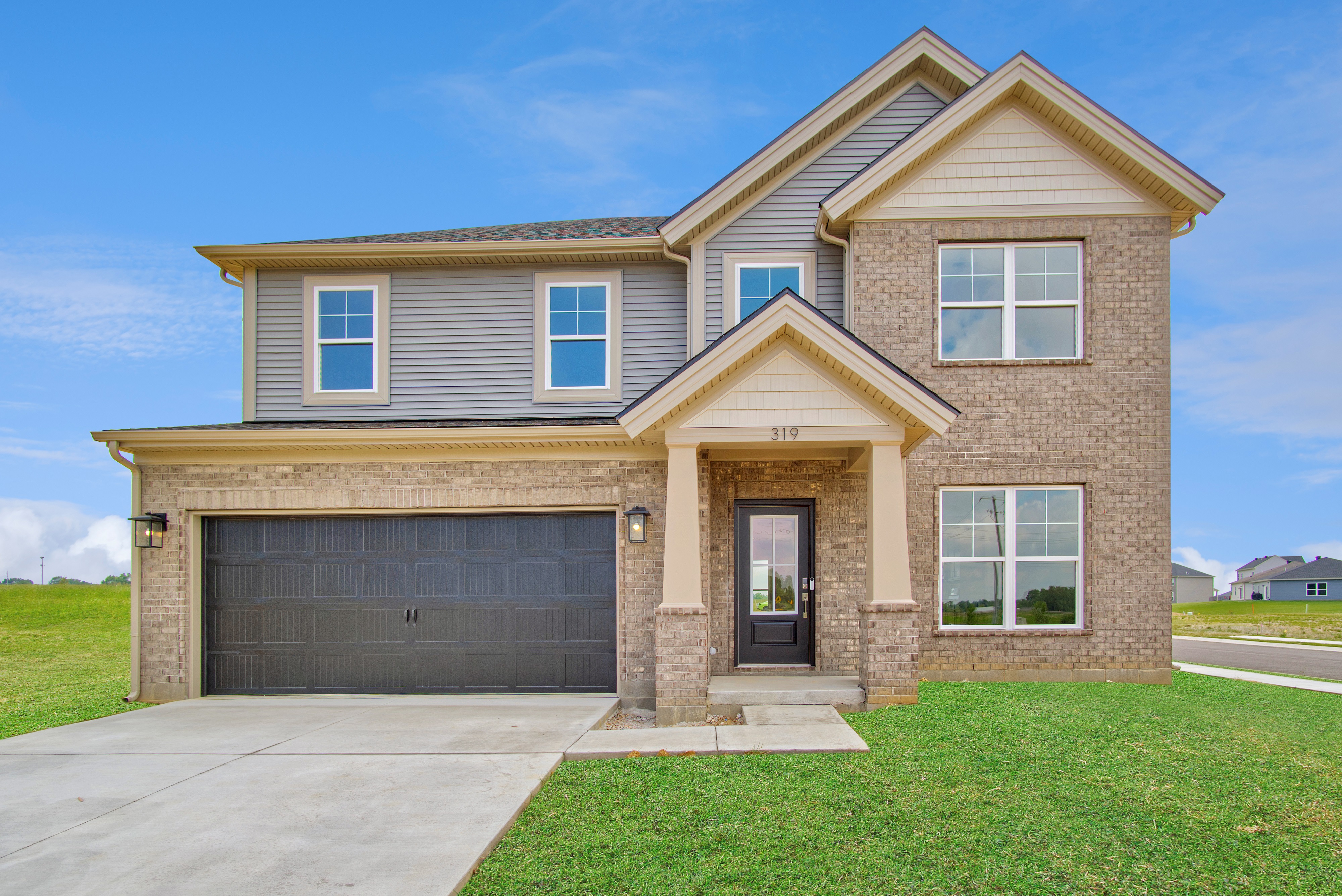create landscaping on the facade of this home with brown mulch and young shrubs make the grass green and well kept