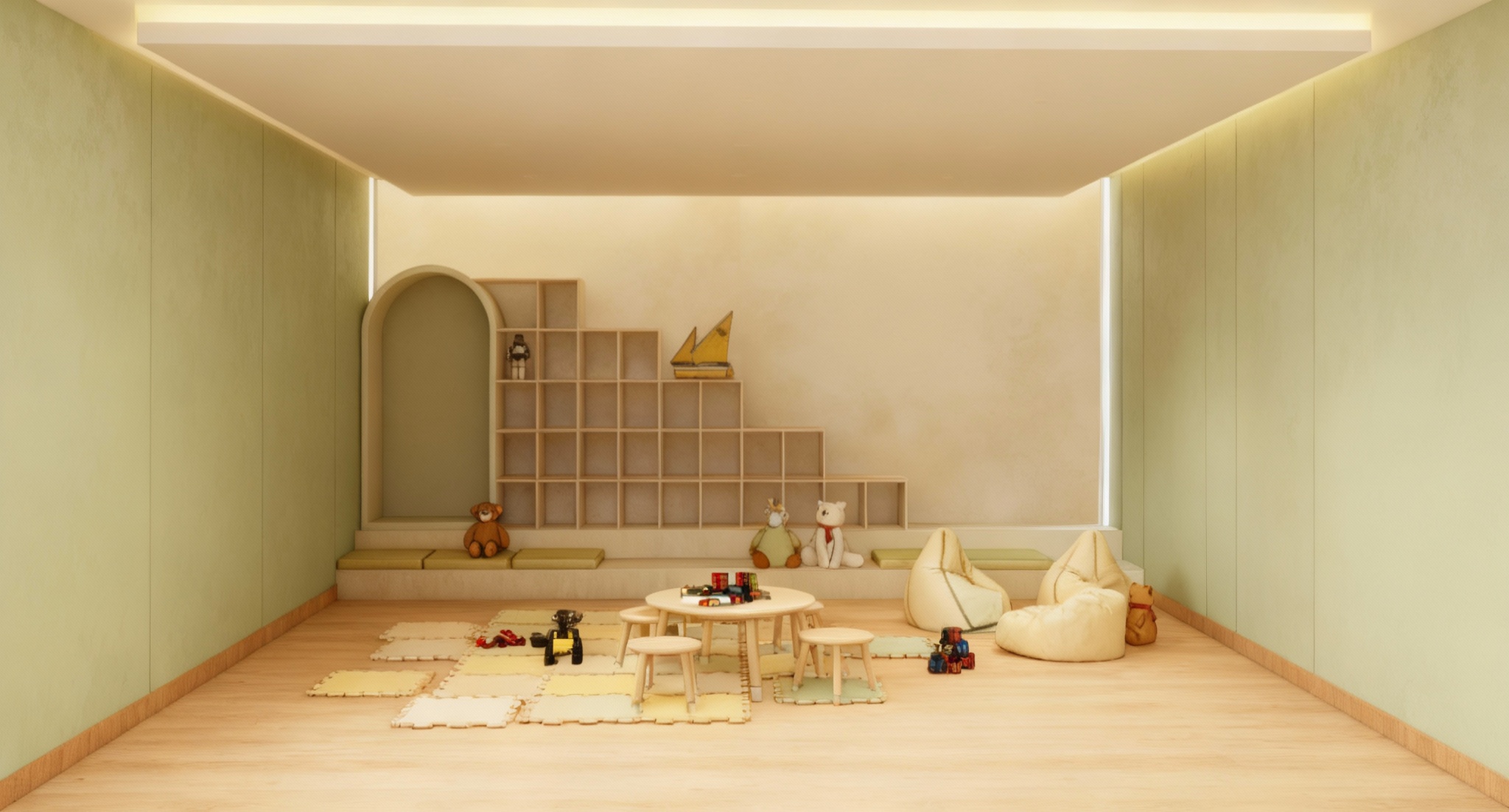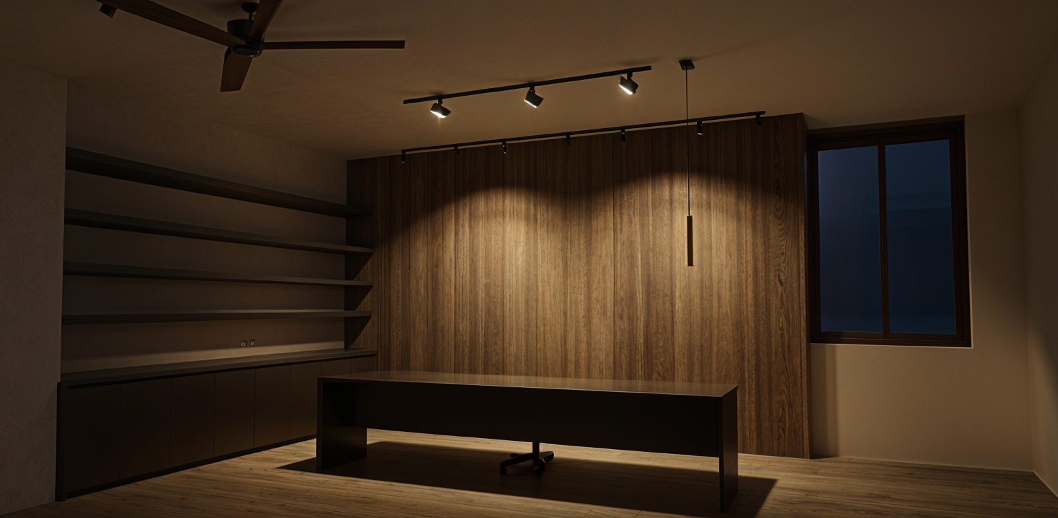evening time lights on keep original floor white background keep the ceiling fan remove extra lights paint walls beige gray remove light in the corner near to bed