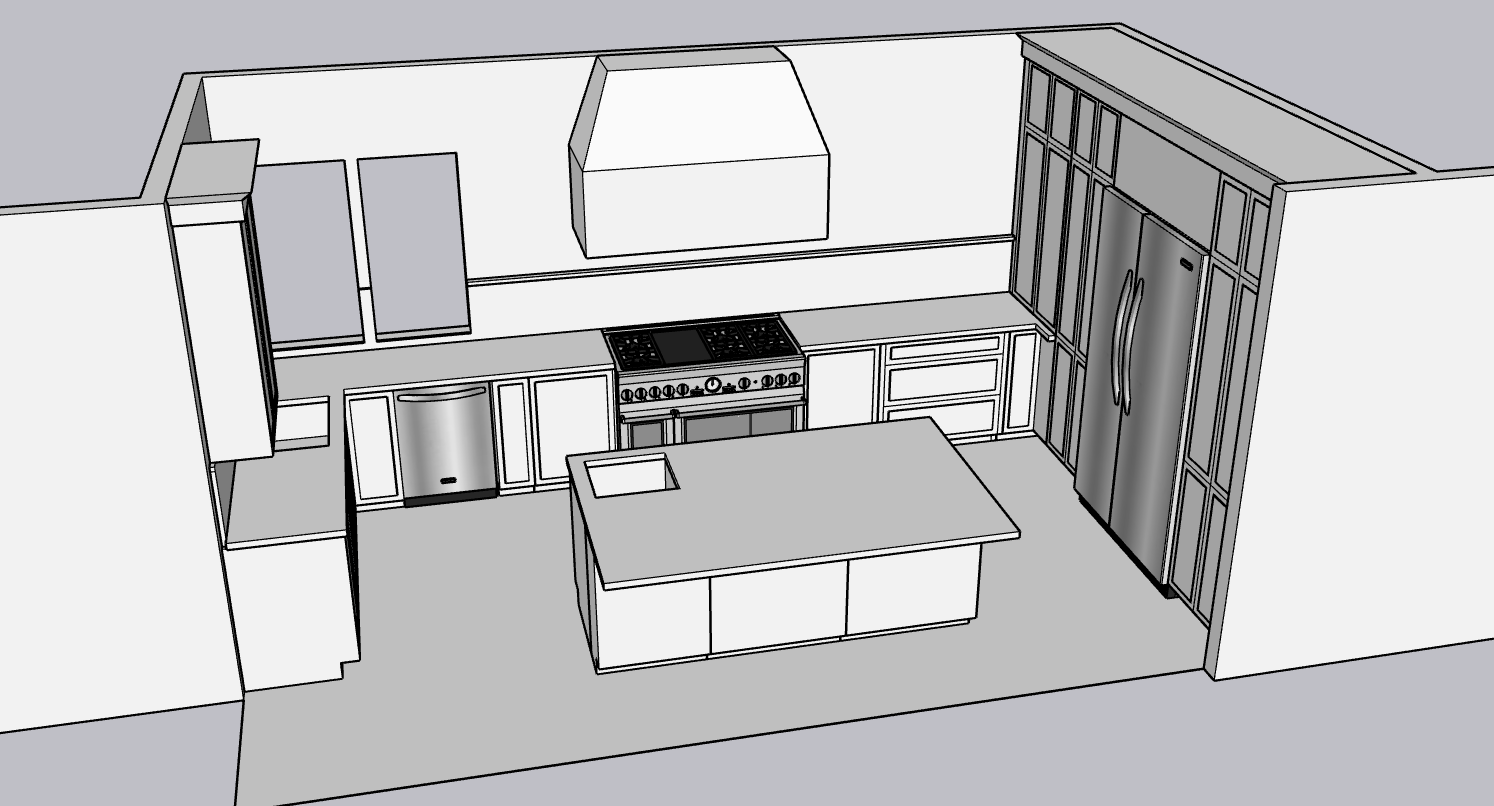 color the cabinets forest green add a warm wood floor a countertop surface and countertop backsplash with lots of veining make the hood vent a plaster finish and make all of the appliances a black stained steel finish add two large pendants above the island and a small pendant in front of each window in the corner